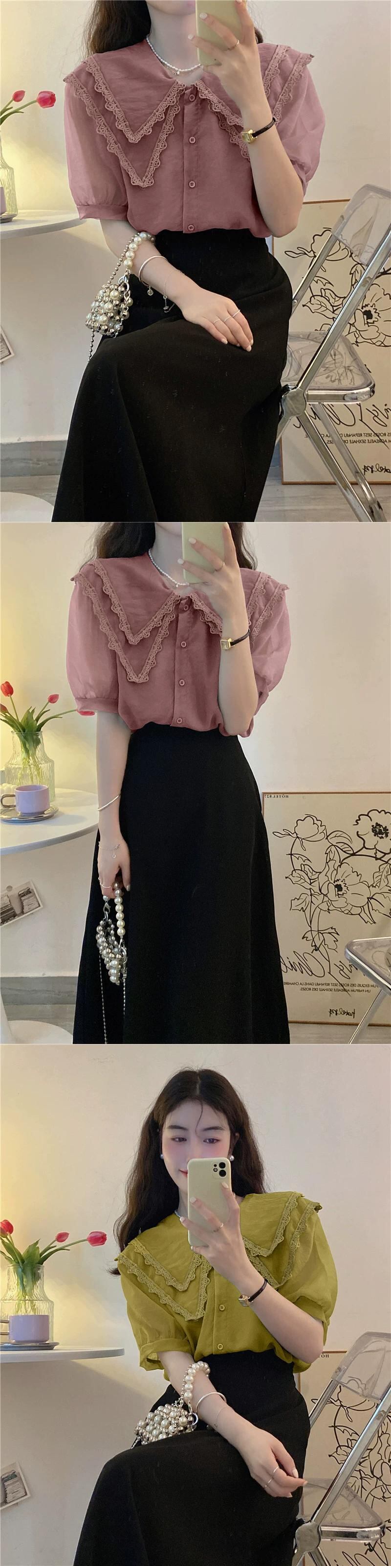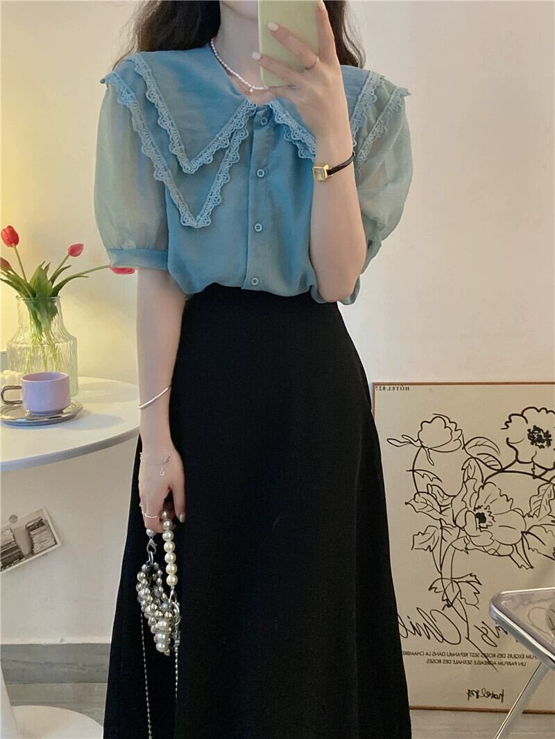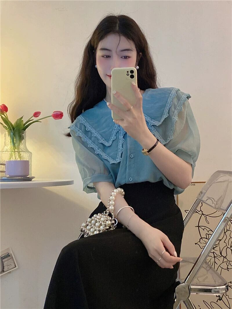 人形襟トップ女性のデザインセンスニッチ夏 2023 新しい気質甘くて優しい半袖シャツ 大人ガーリー スウィート キュート カジュアル サマー 夏物 8571682090135645