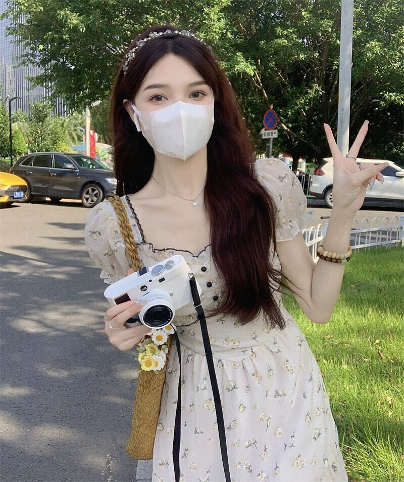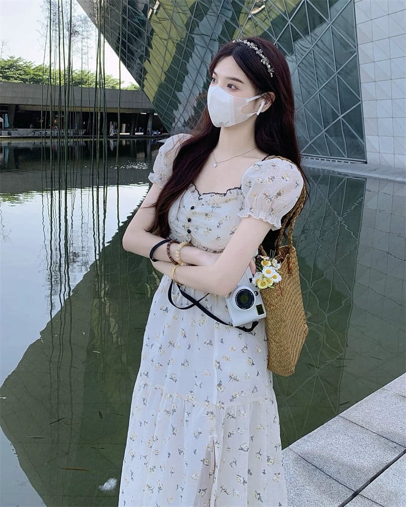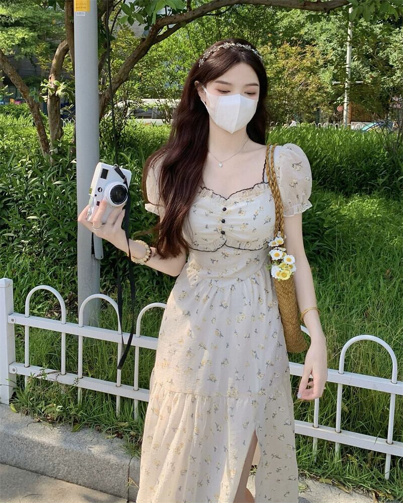 パフスリーブ花柄ドレス女性夏フレンチ初恋優しい風バックリボンシックなスリットロングスカート サマー 夏物 8571695940304012