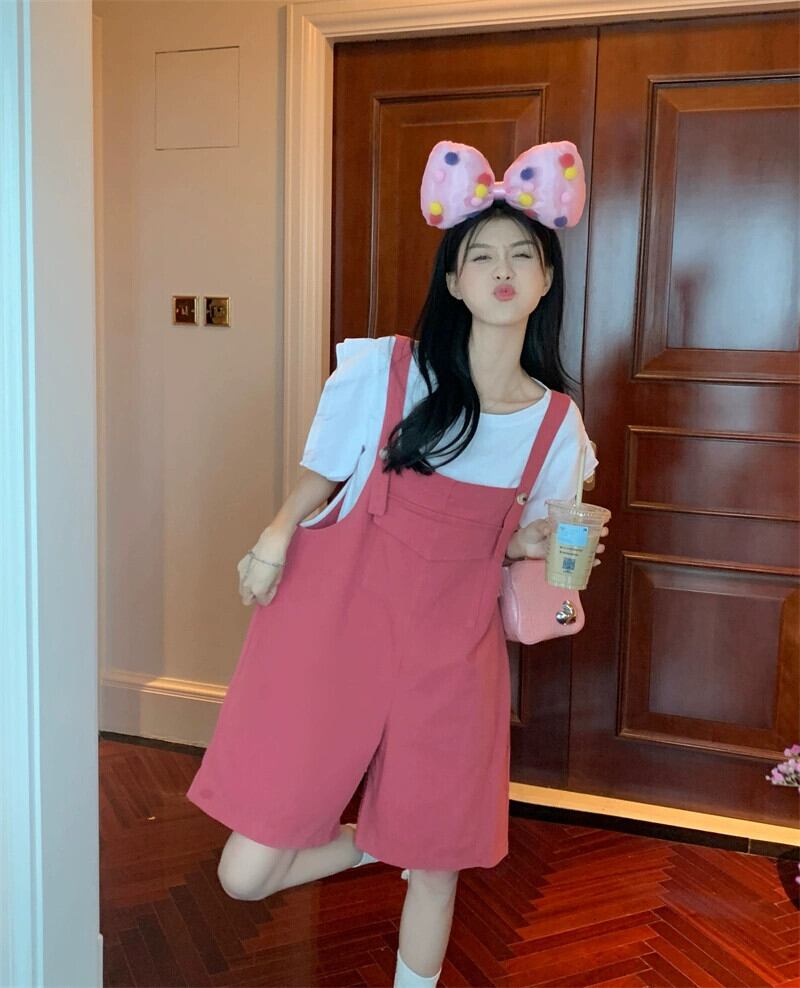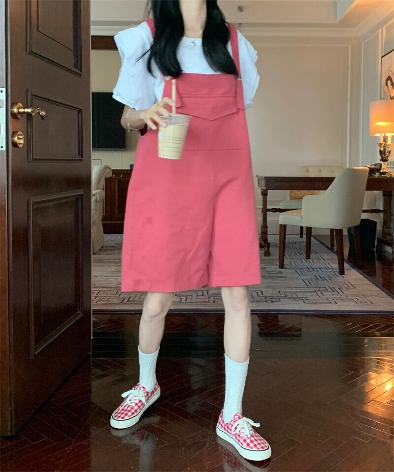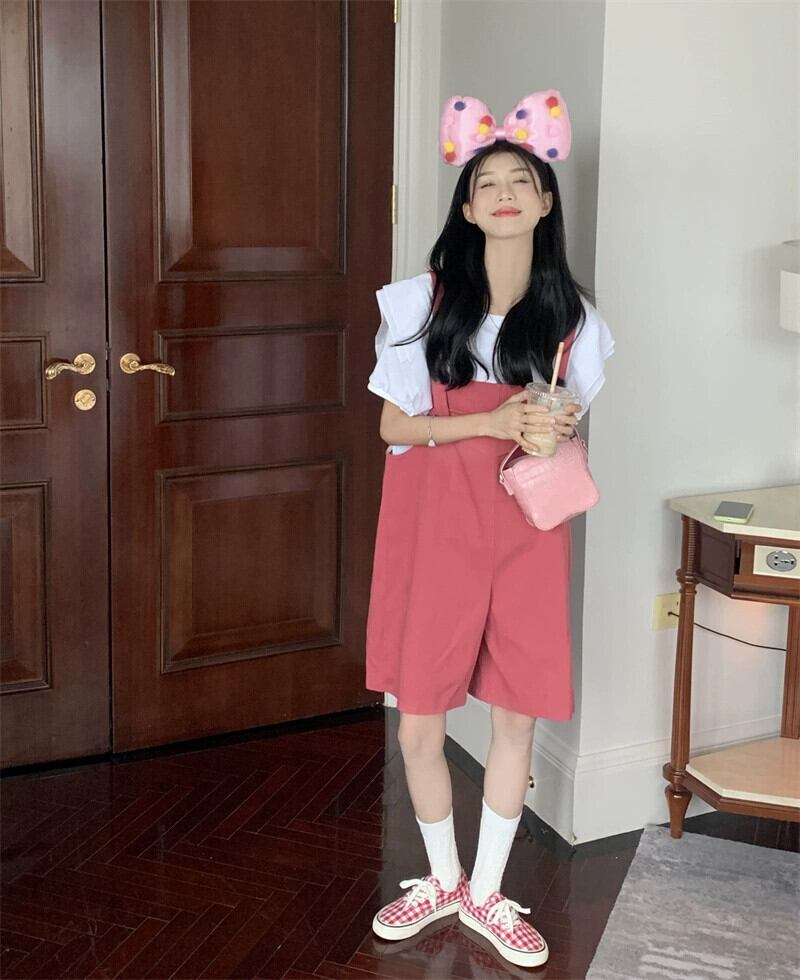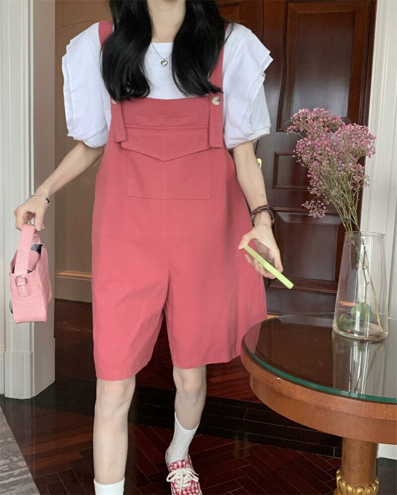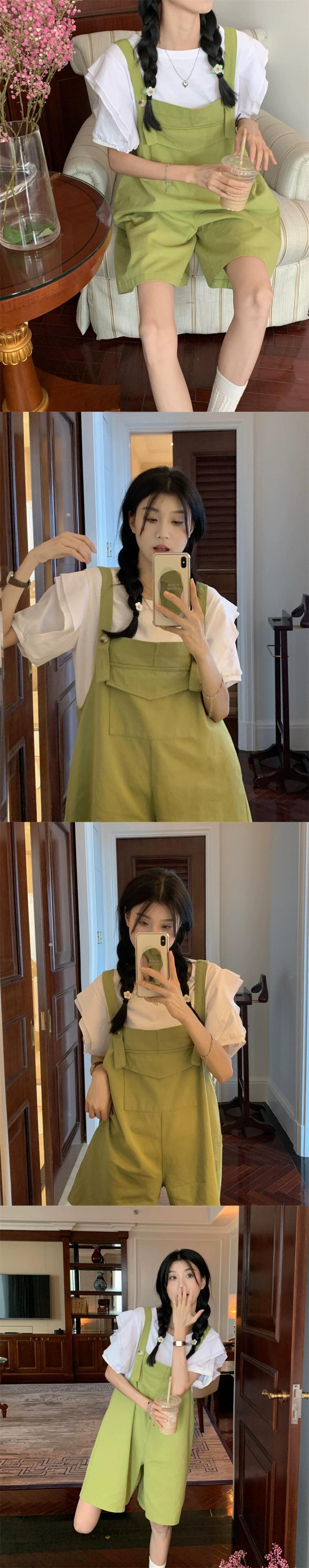 色:白いTシャツ,緑のオーバーオール,ピンクのオーバーオール