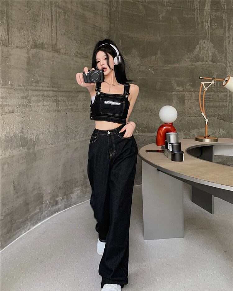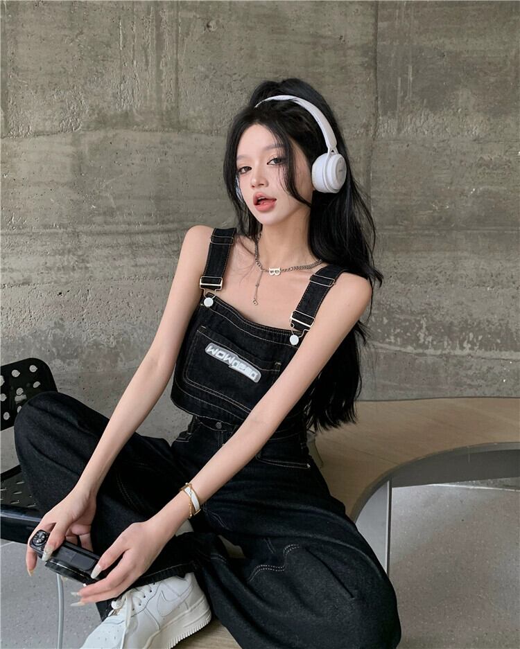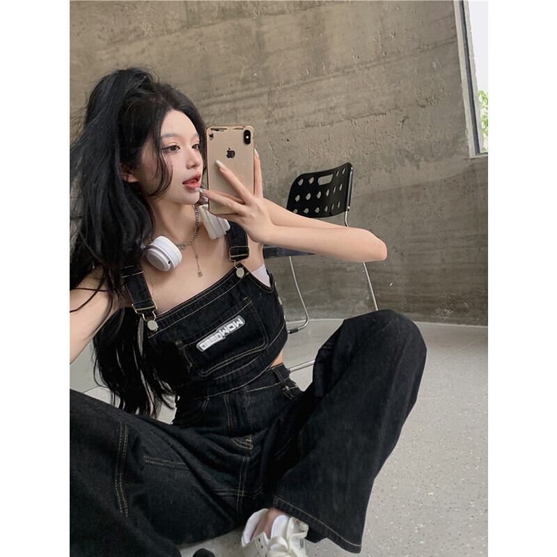 スプリットデニムオーバーオールレディースバージョンルーズサマーデザインセンスニッチフライストリートブラックワイドレッグパンツ 夏物 8571617992178634