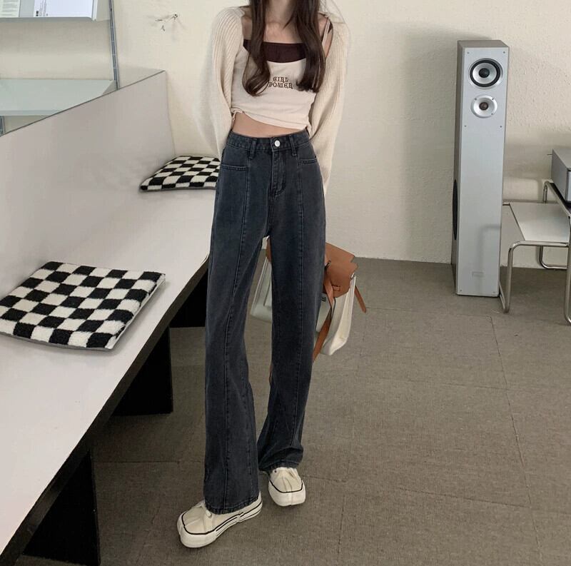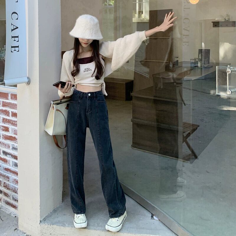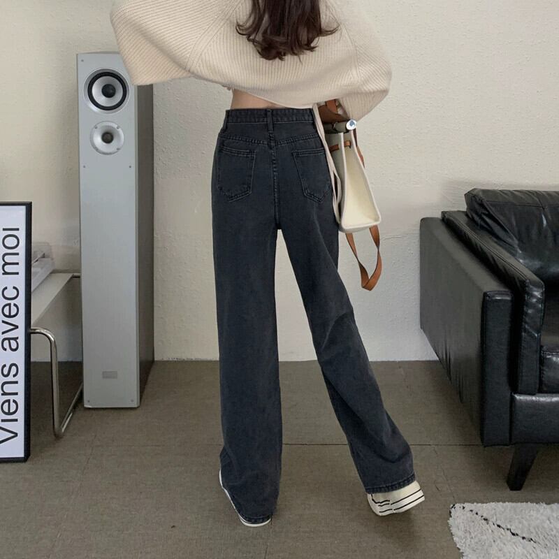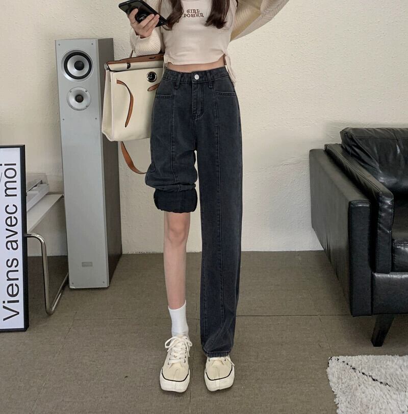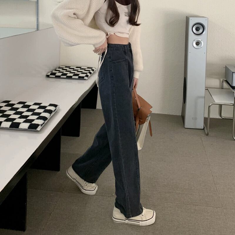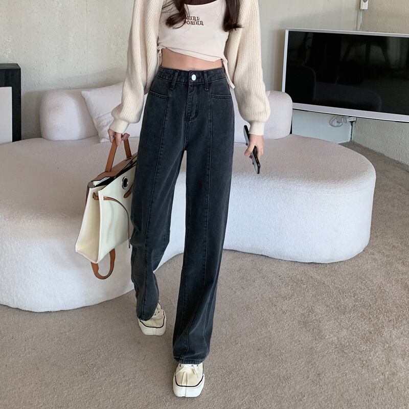黒とグレーのワイドレッグジーンズレディースルーズストレート2023秋の新しいニッチデザインスリムハイストリートパンツ ブラック オータム 秋物 8571627296010905