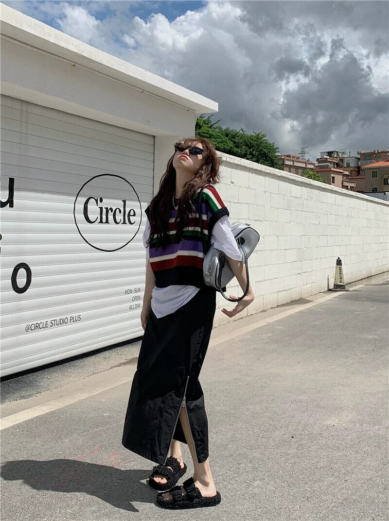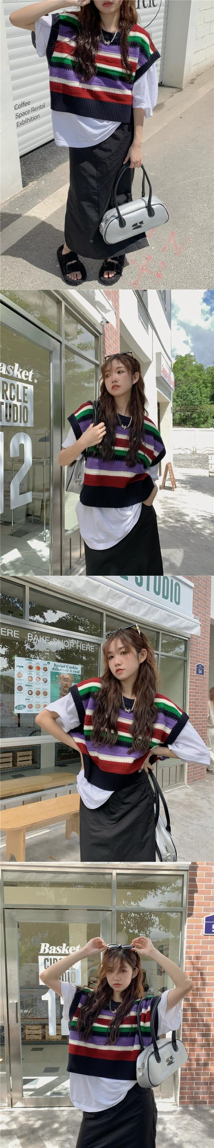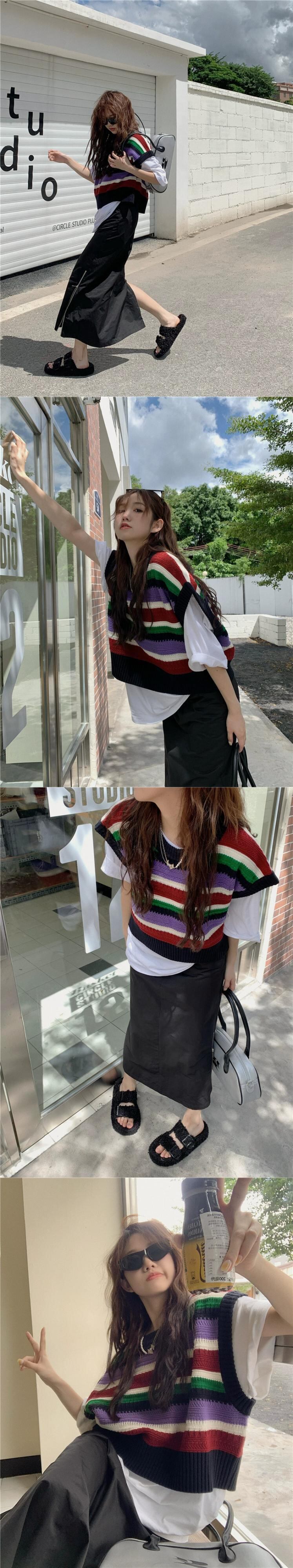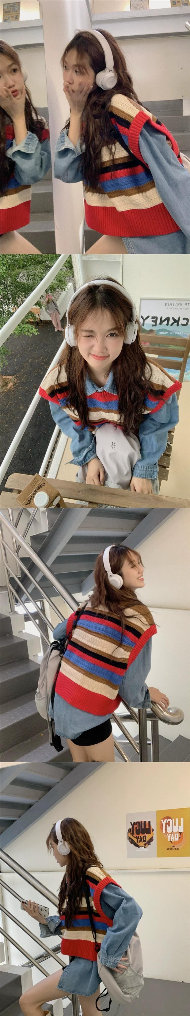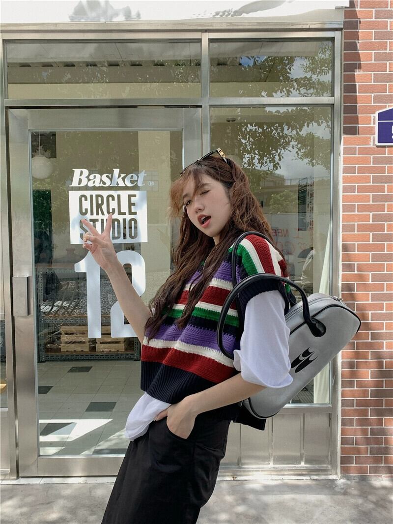 レインボーストライプニットベストレディース秋アウターノースリーブセーターベストネットレッドルーズショートベスト 8571663614801168