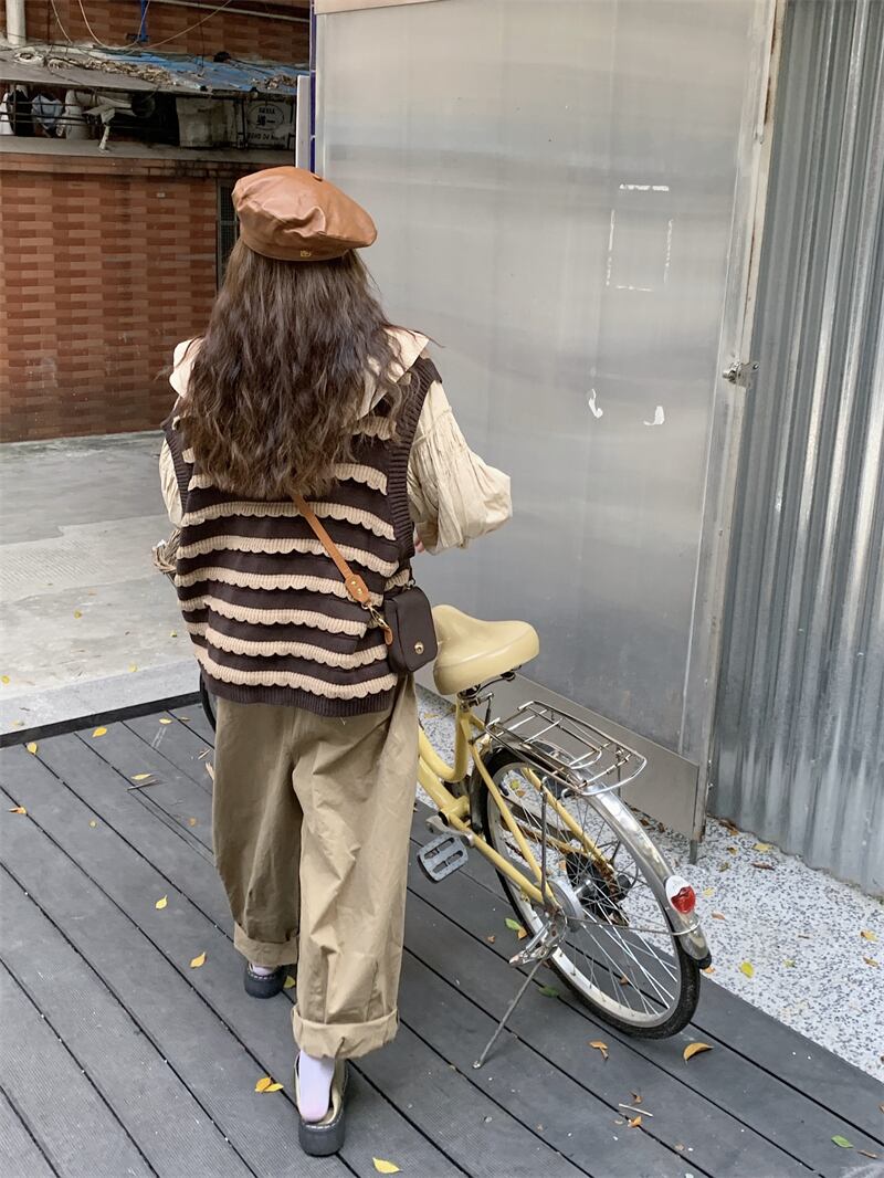 ストライプニットベストレディース秋シャツレイヤードVネックセーターベストレトロノースリーブベストベスト レッド オータム 秋物 8571628508406329