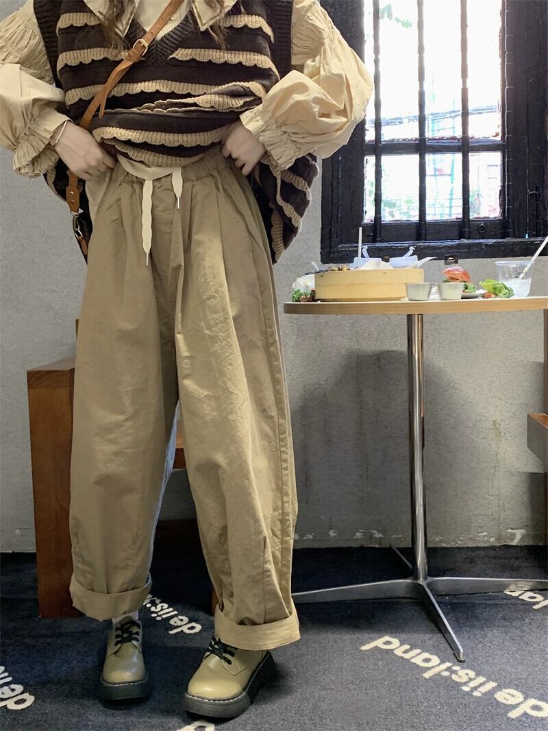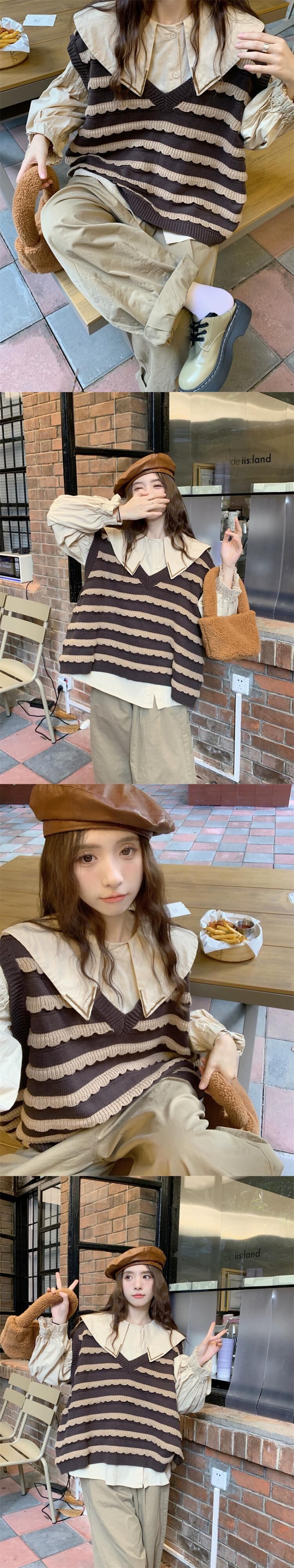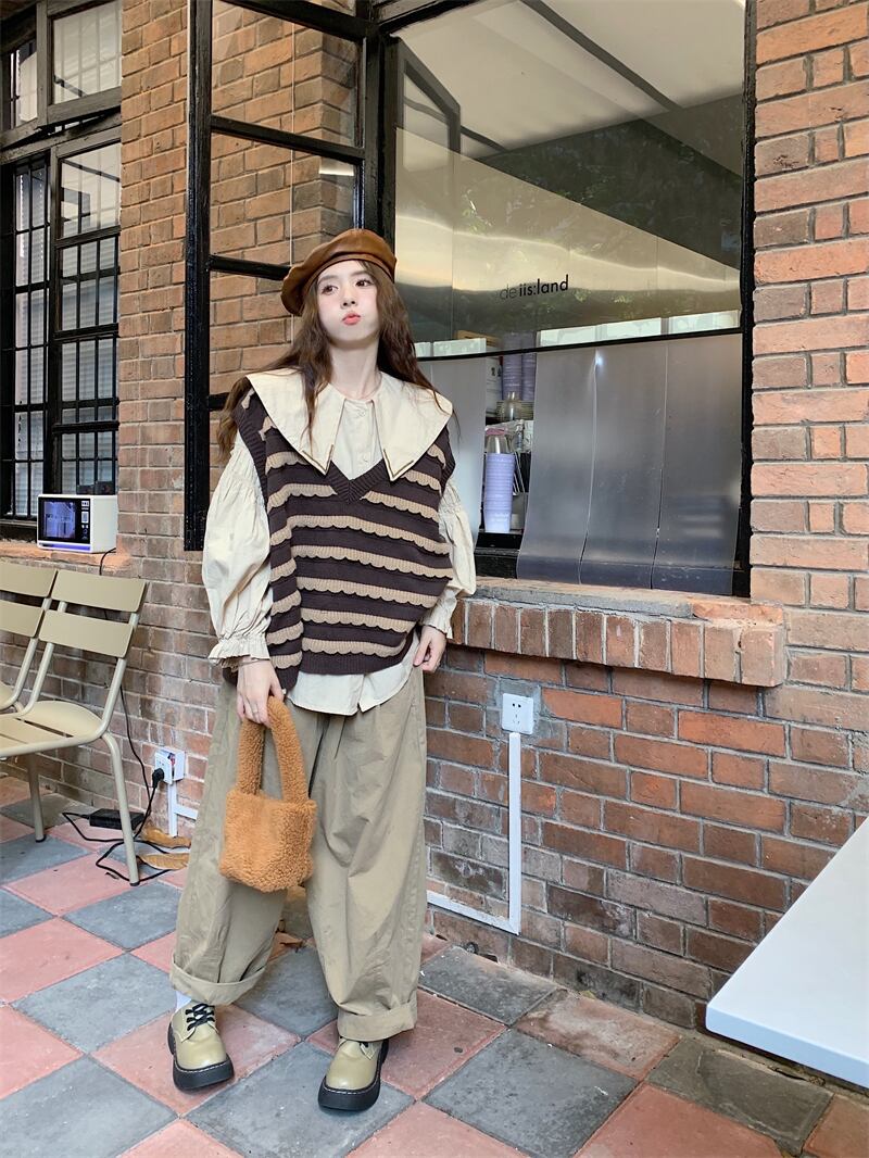色:ストライプベスト,パフスリーブ大襟シャツ,太い脚のパンツ
