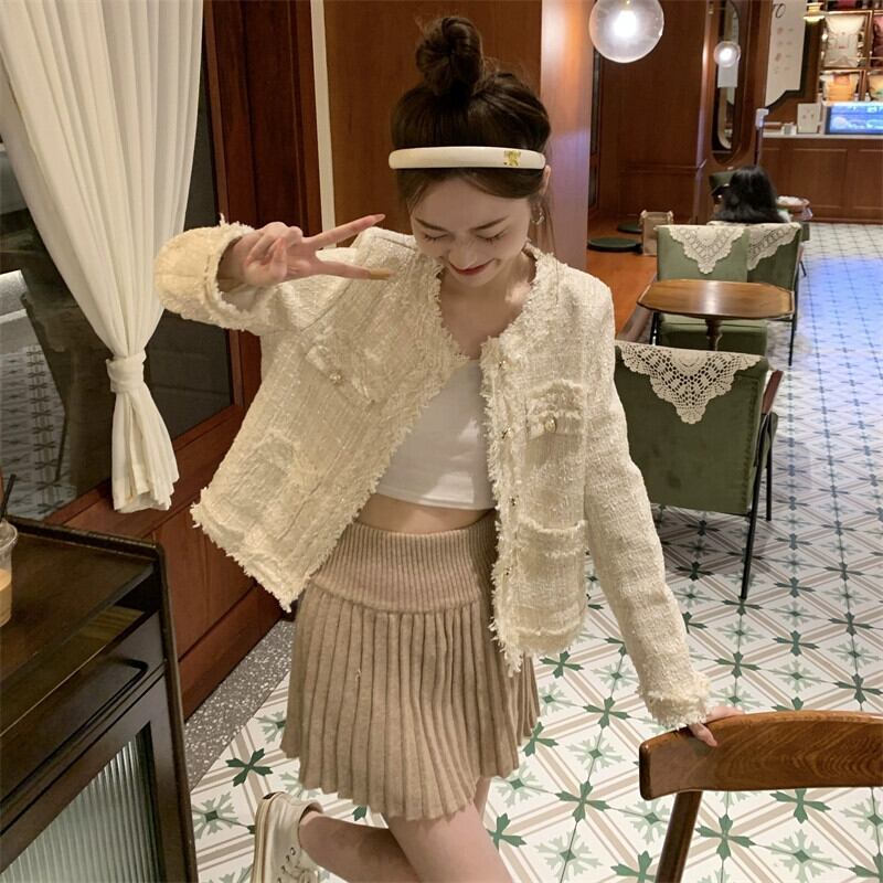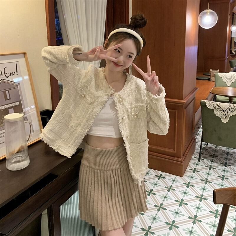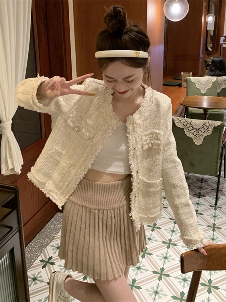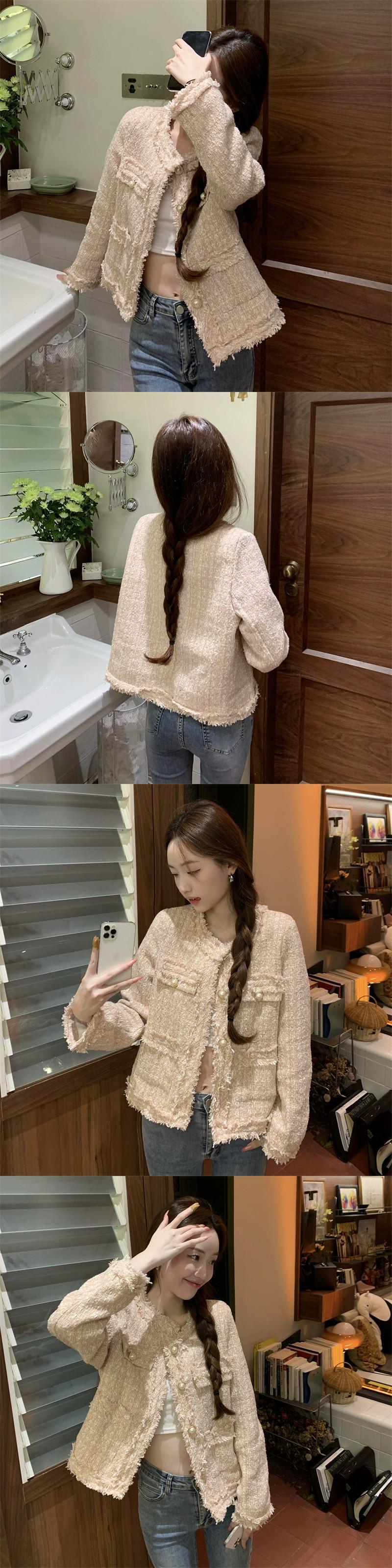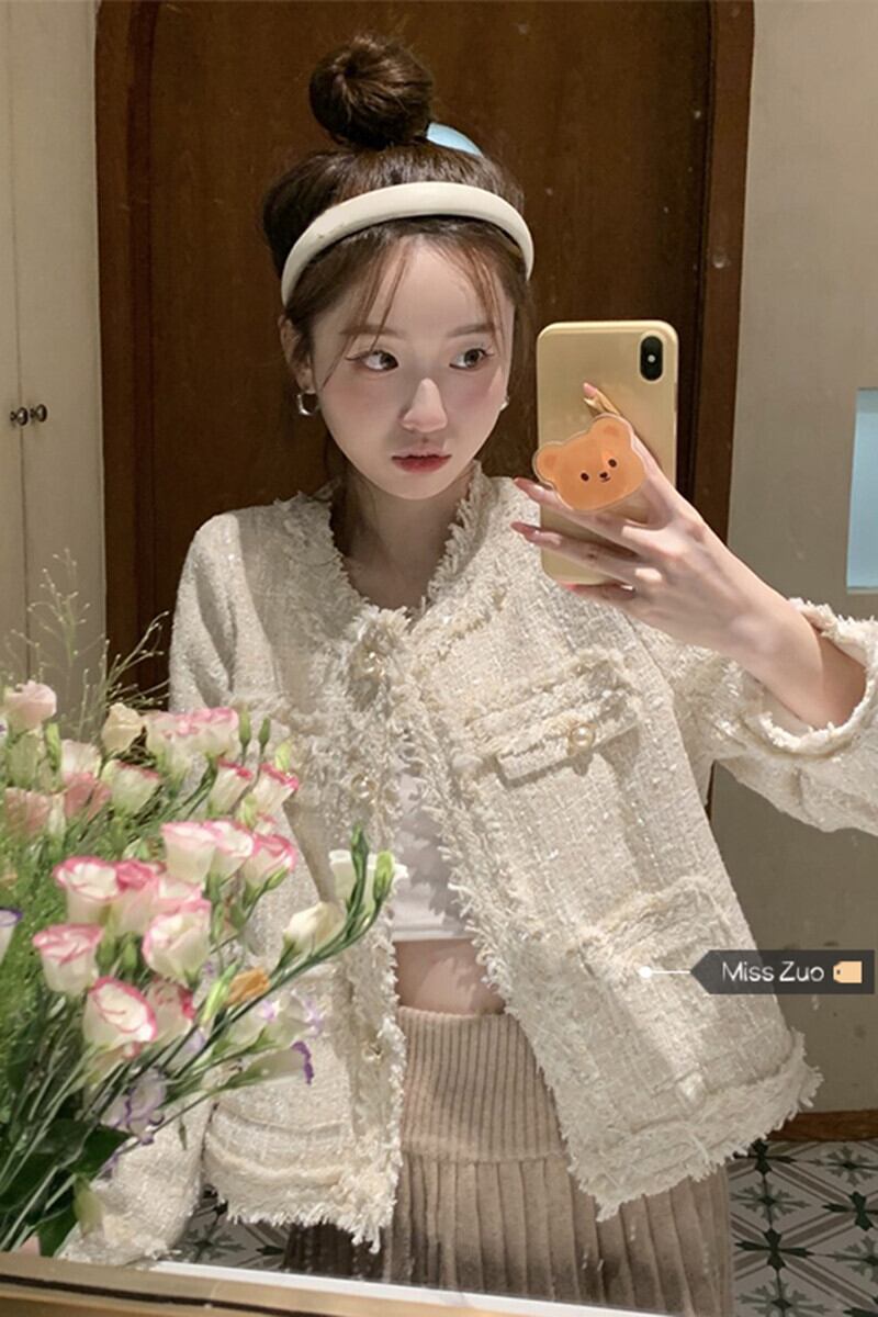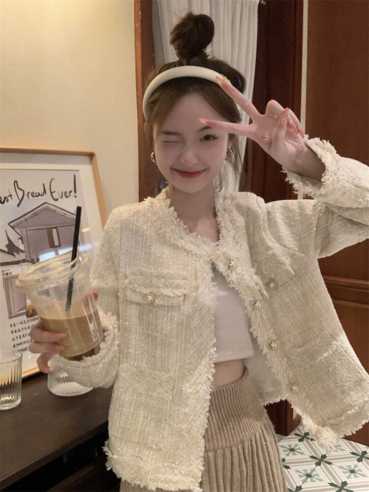 ツイードの小さな香りのウィンドジャケット女性の春肥厚2023新しい高級気質セレブホワイトショートトップ スプリング 春物 8571678642171930