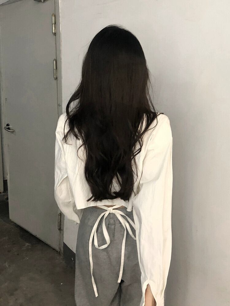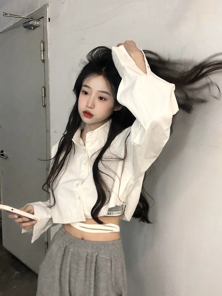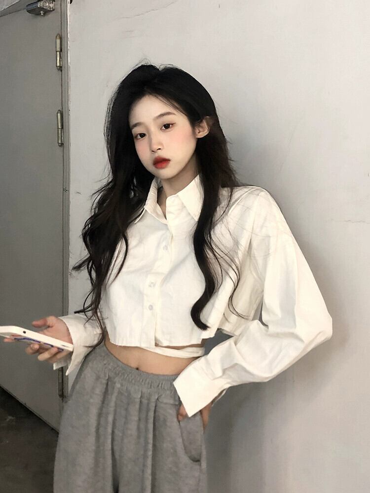 白長袖シャツレディース秋シャツ2023新しいデザインセンスニッチスイートクールシックショートトップ ロング ホワイト 大人ガーリー スウィート キュート カジュアル オータム 秋物 8571648755316070