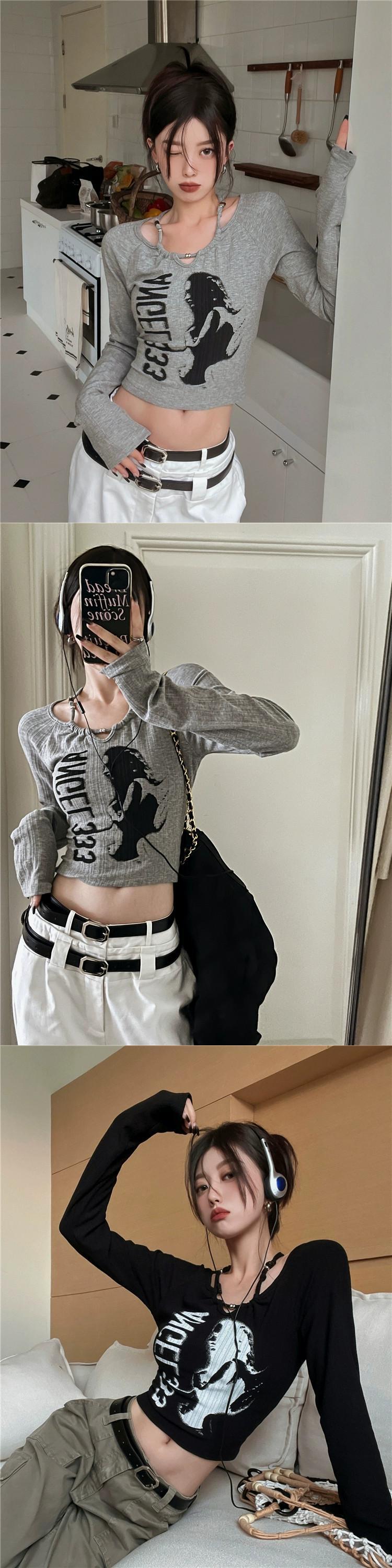 Sweet Spice Girls ショートトップ レディース 春感 ニッチ アメリカンスタイル ユニーク シック ブラック フロントショルダー 長袖 Tシャツ ロング 大人ガーリー スウィート キュート カジュアル スプリング 春物 8571676963653946
