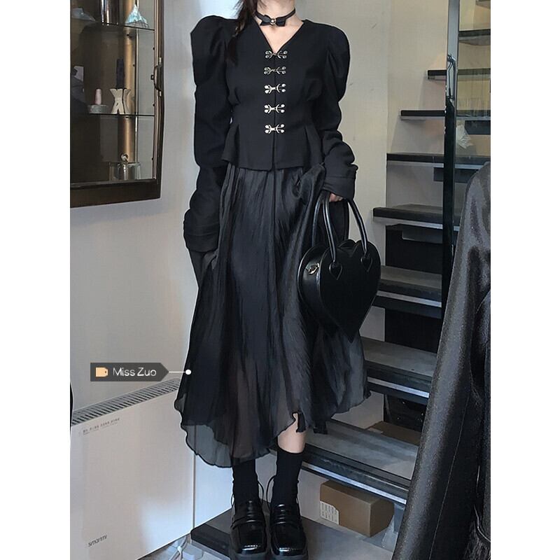 黒ガーゼスカートの女性の春と秋のハイウエスト薄手の A ラインスカート 2023 新しい小さなスーパーフェアリーロングスカート ハイウェスト ブラック スプリング 春物 オータム 秋物 Aライン 8571641751717241