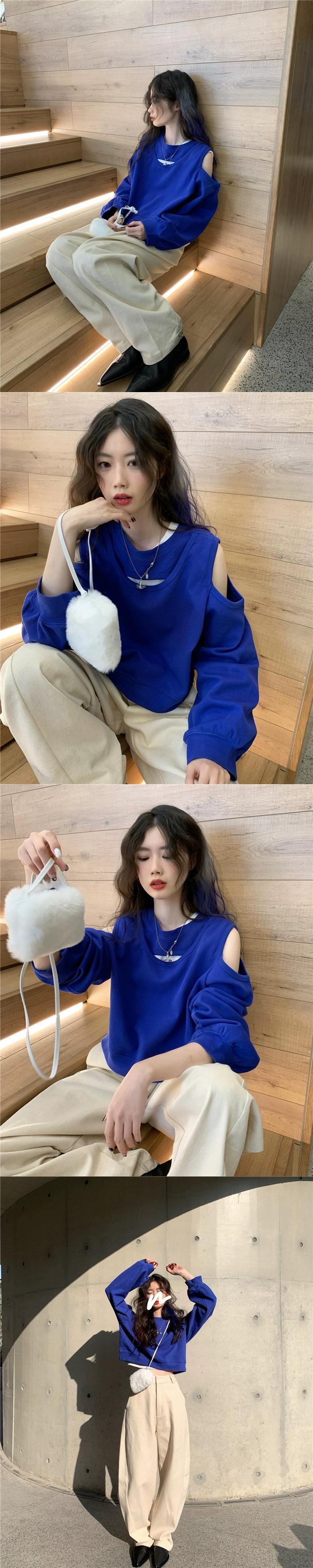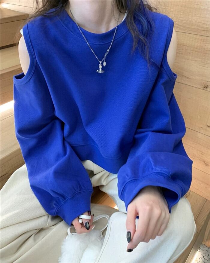 カーキオフショルダーセーター女性の2023秋の新しいファッションeignスタイルのデザインセンス小さな長袖ショートトップ ロング オータム 秋物 8571648027271028