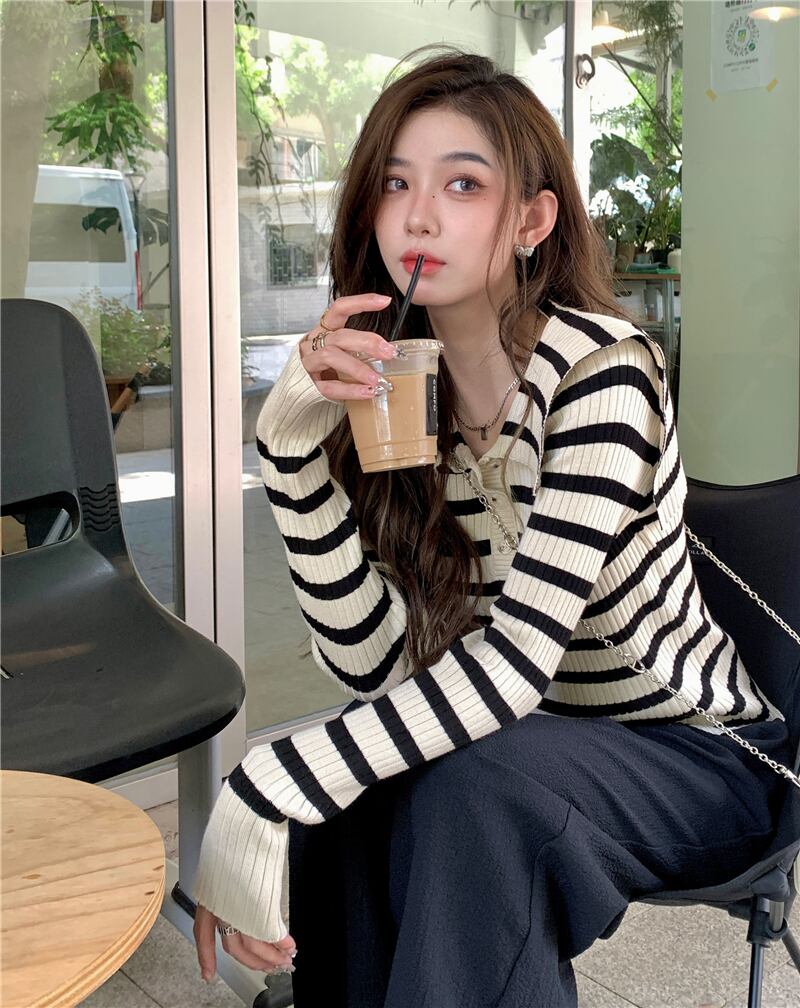 ネイビーカラーストライプ長袖ニットセーター女性の2023年秋の新しいユニークでユニークなスタイルのスリムショートトップ ロング オータム 秋物 8571630782825350