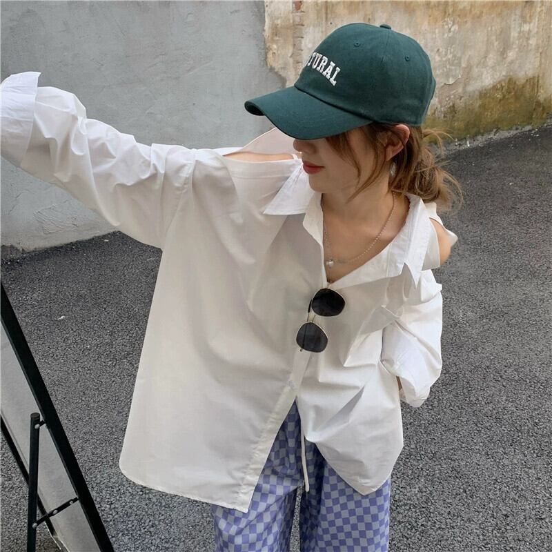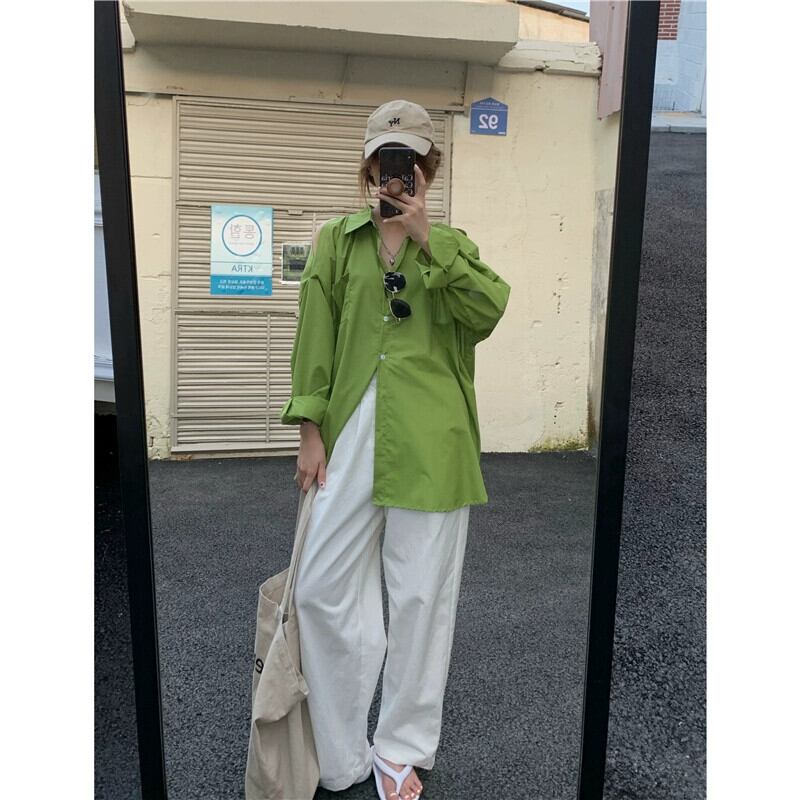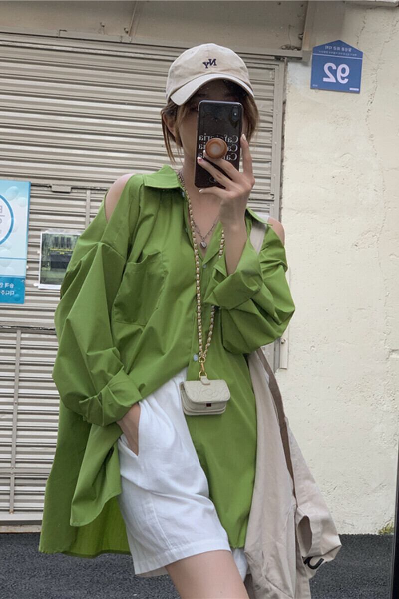 緑の日焼け止めシャツの女性の初秋の薄いセクションのデザインセンスのニッチバージョン、ルーズでユニークなシックな長袖オフショルダートップ ロング オータム 秋物 グリーン 857164405333524