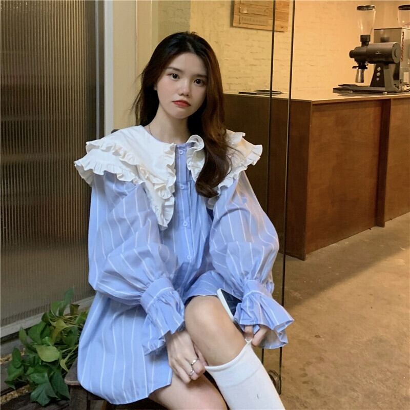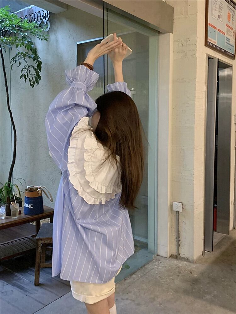ストライプドールカラーシャツ婦人服デザインセンスニッチ日焼け止めシャツ春秋フレンチソルトスイート長袖トップ ロング 大人ガーリー スウィート キュート カジュアル スプリング 春物 オータム 秋物 8571622292507382
