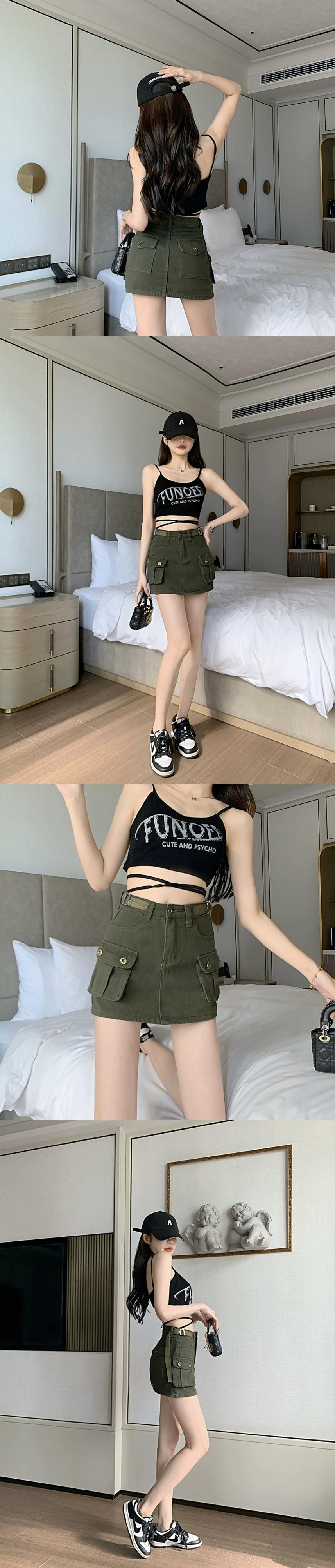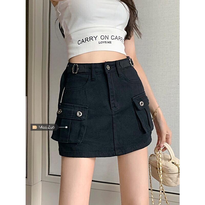 黒ツーリングデニムスカートレディース秋デザインセンス小男ハイウエストAラインスカートバッグヒップショートスカート ハイウェスト ブラック オータム 秋物 8571627228460310
