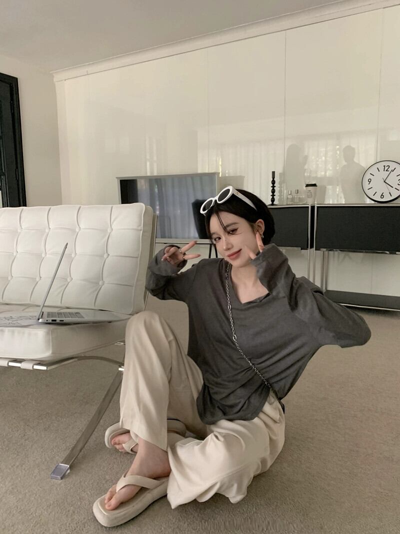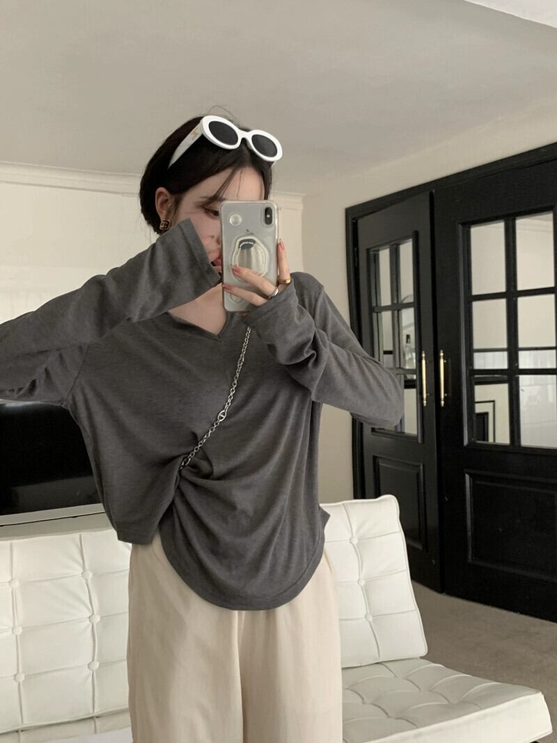 グレー長袖Tシャツレディース初秋薄手セクション2023新しいデザインセンスニッチユニークでシックなVネックトップ服 ロング オータム 秋物 8571645415664140