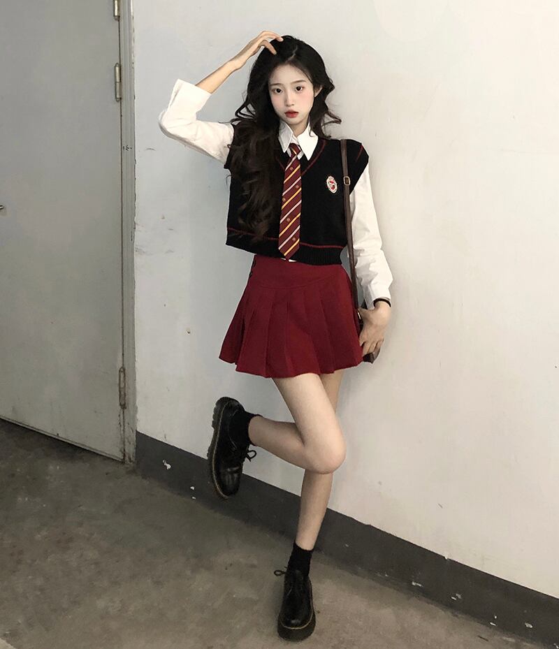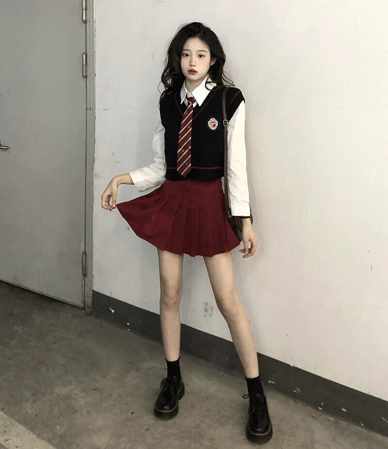 色:ネクタイ付き長袖シャツ,ベストベスト,赤プリーツスカート