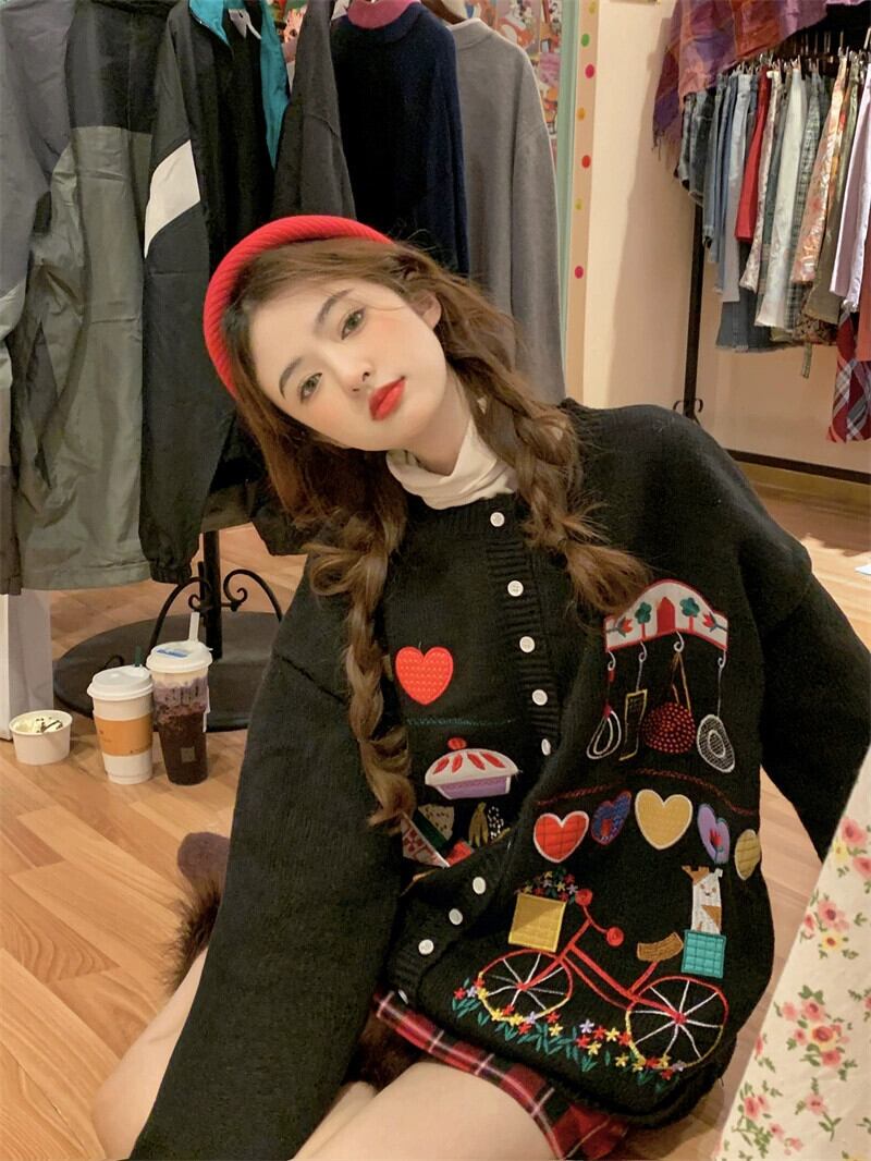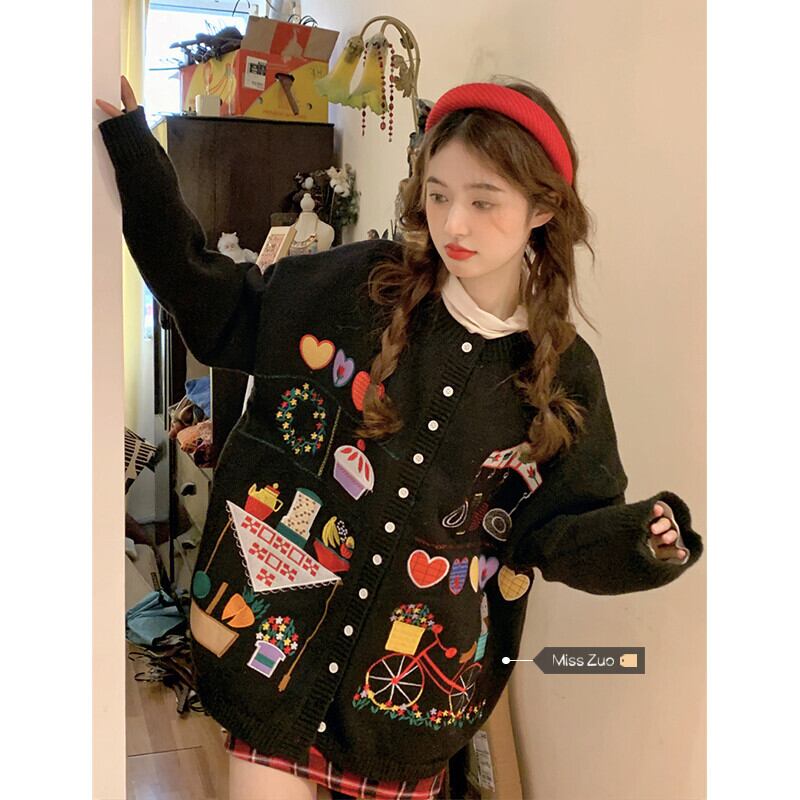 甘い風セータージャケット女性の冬肥厚 2023 新しい緩い怠惰なレトロ黒ニットカーディガン ブラック 大人ガーリー スウィート キュート カジュアル ウィンター 冬物 8571656679508583