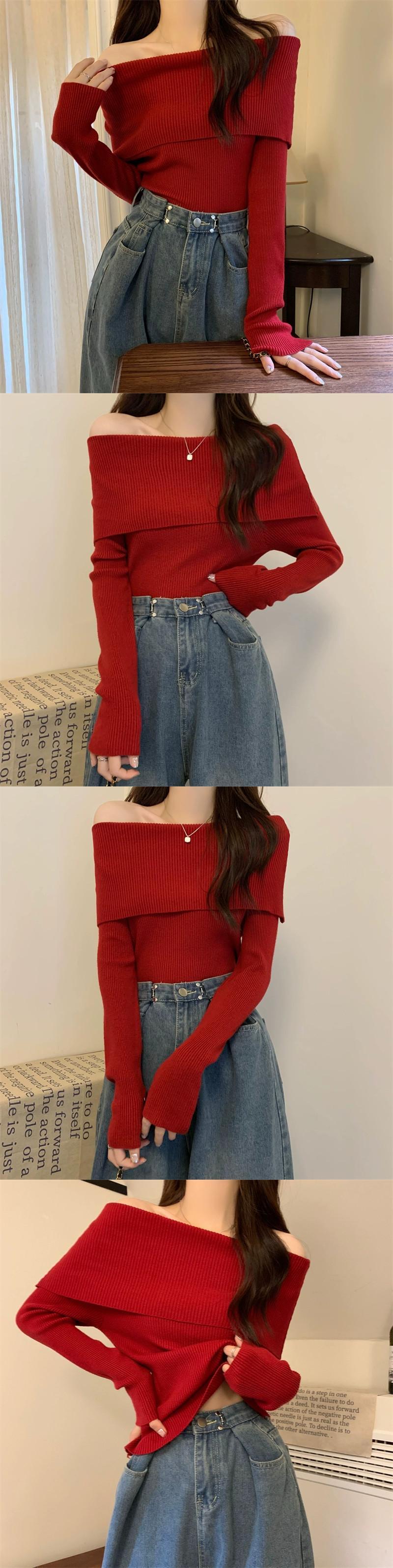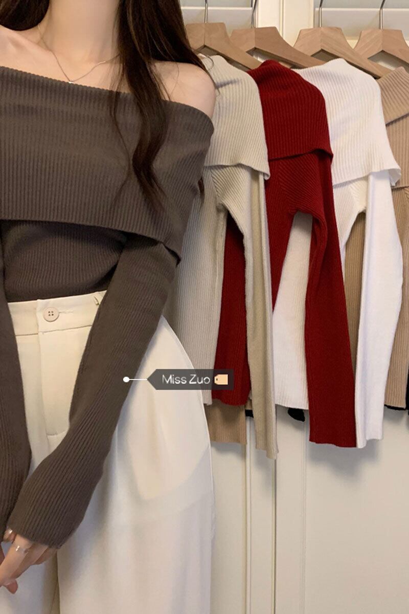ワンショルダートップレディース2023秋冬新作ハイエンドシックでシックなユニークな爆発的なショートニットセーター オータム 秋物 ウィンター 冬物 8571618755281384