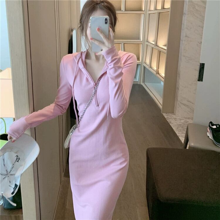 ピンクのフード付きセータードレスの女性の 2023 春の新しいシックなユニークなウエスト痩身カジュアルロングスカート スプリング 春物 8571652940832850
