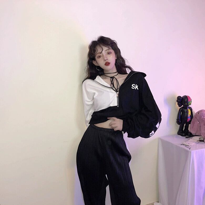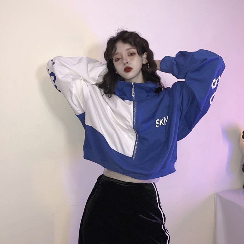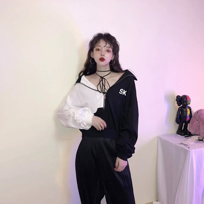 カラーマッチングハーフジッパーセーターレディース2023秋新作アメリカンレトロデザインセンス長袖ショートトップトレンディイン ロング オータム 秋物 8571697961798273