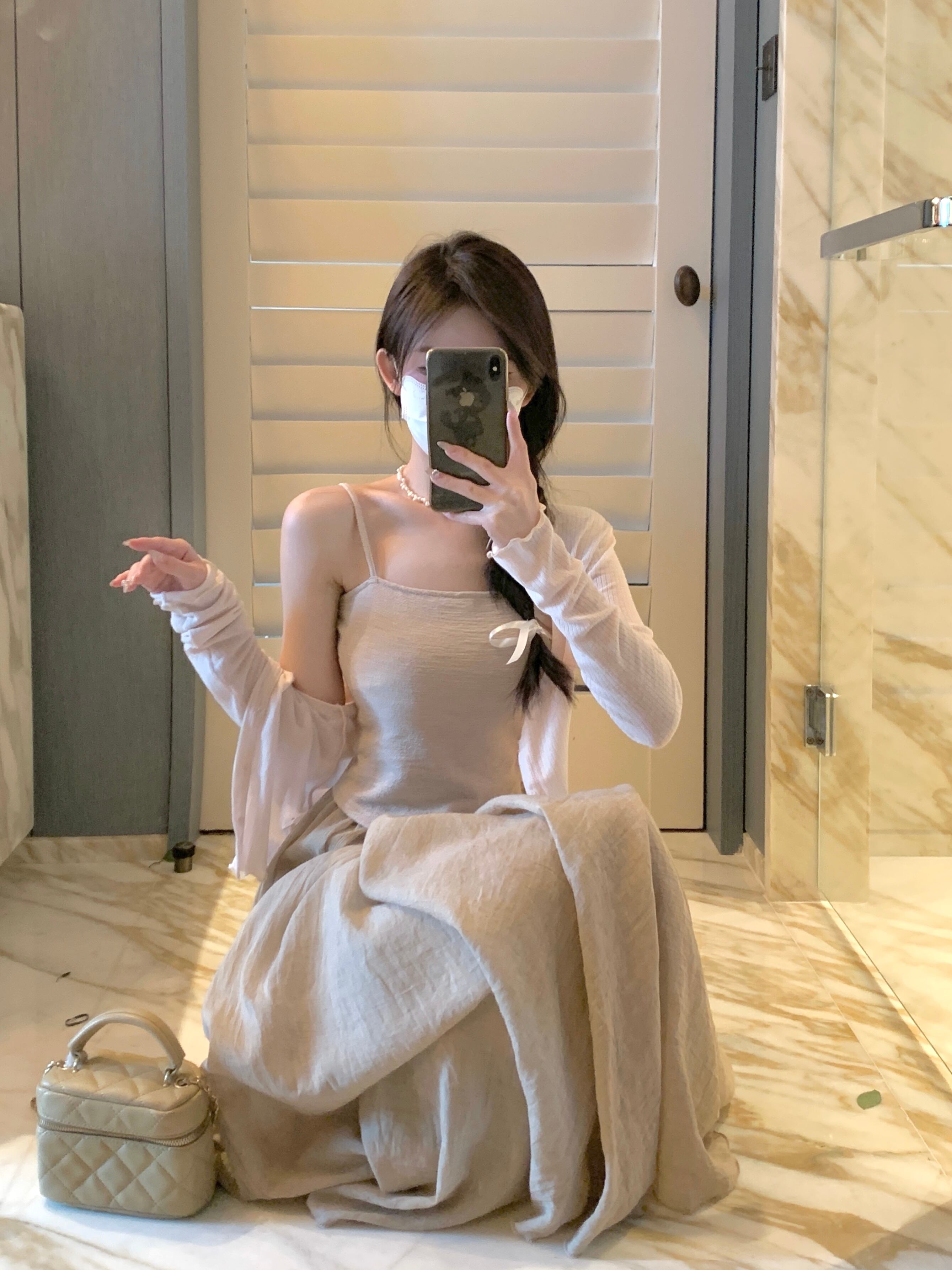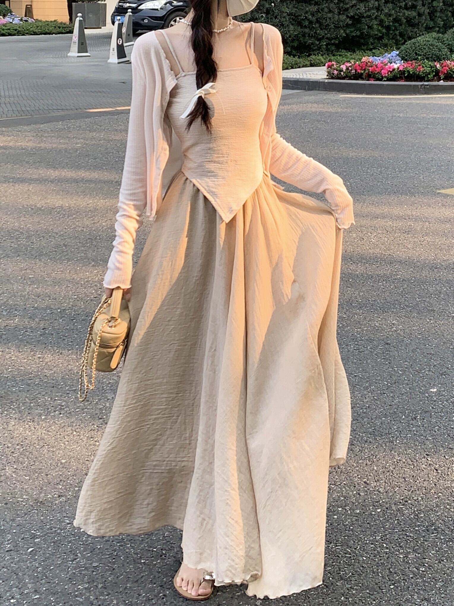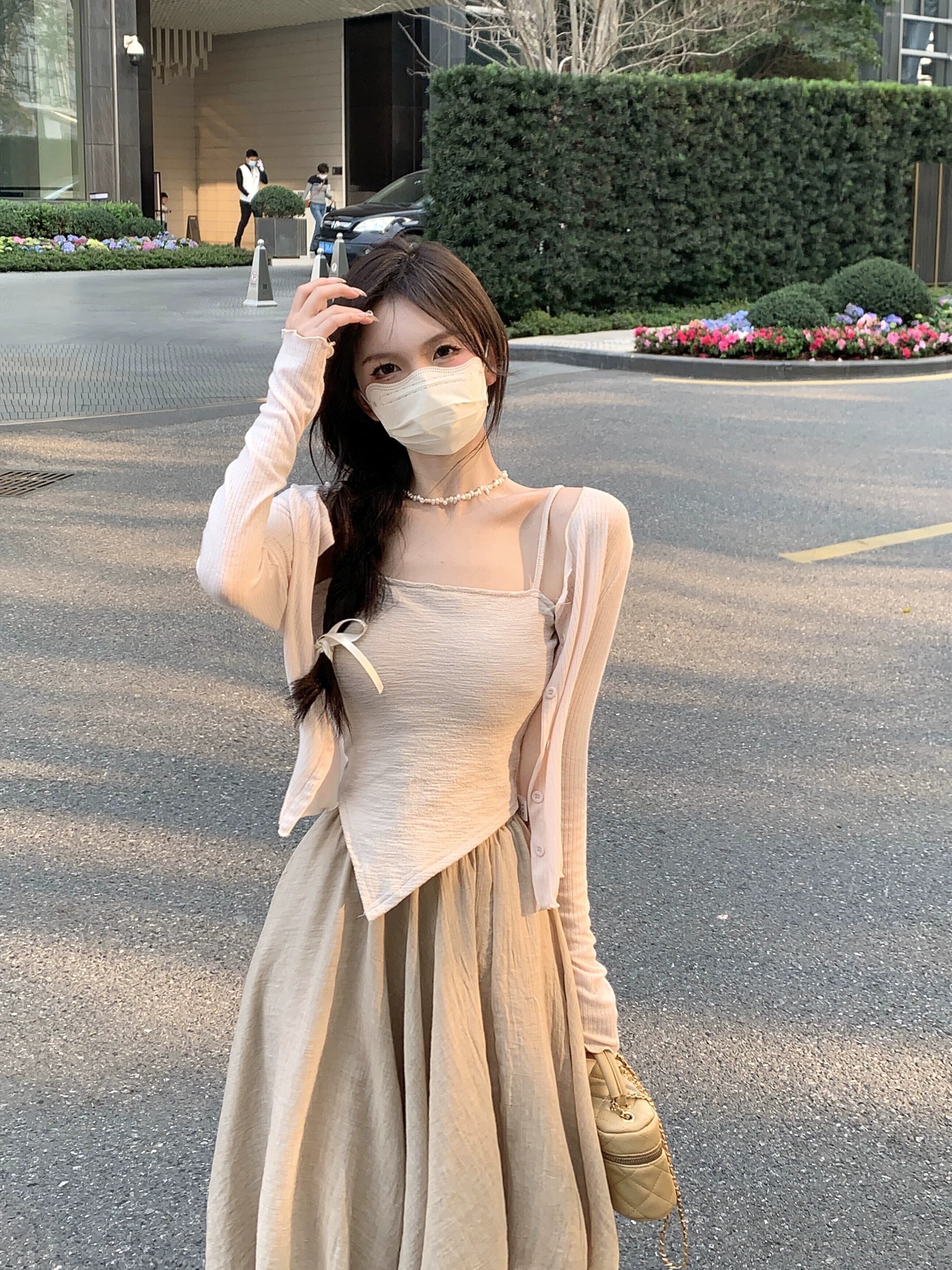色:ベージュカーディガン,グレーアーモンドタンクトップ,ミルクコーヒースカート
