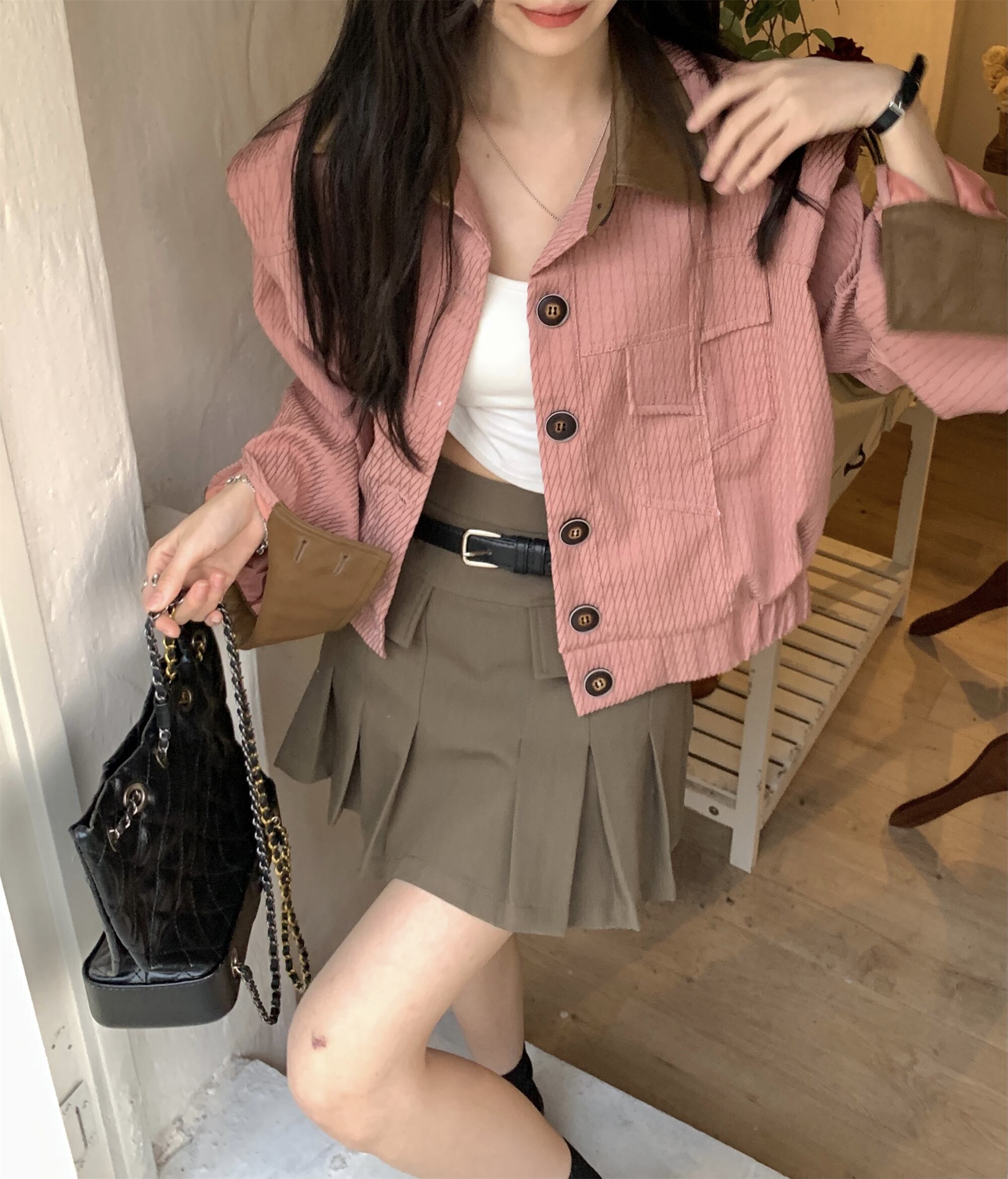 色:カーキ色のスカート,ピンクのジャケット