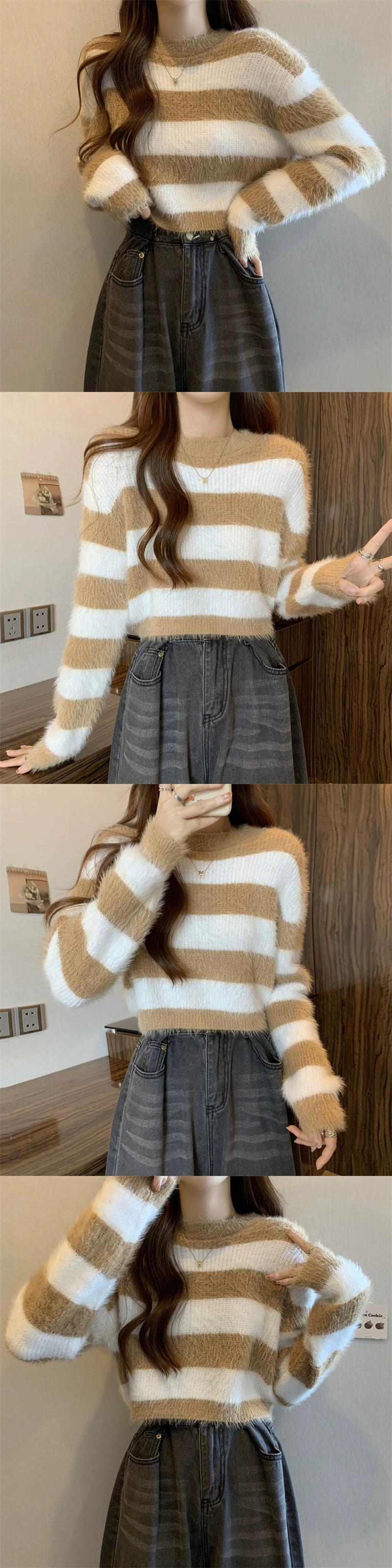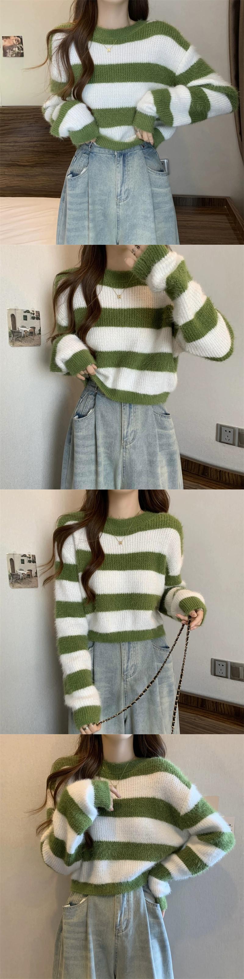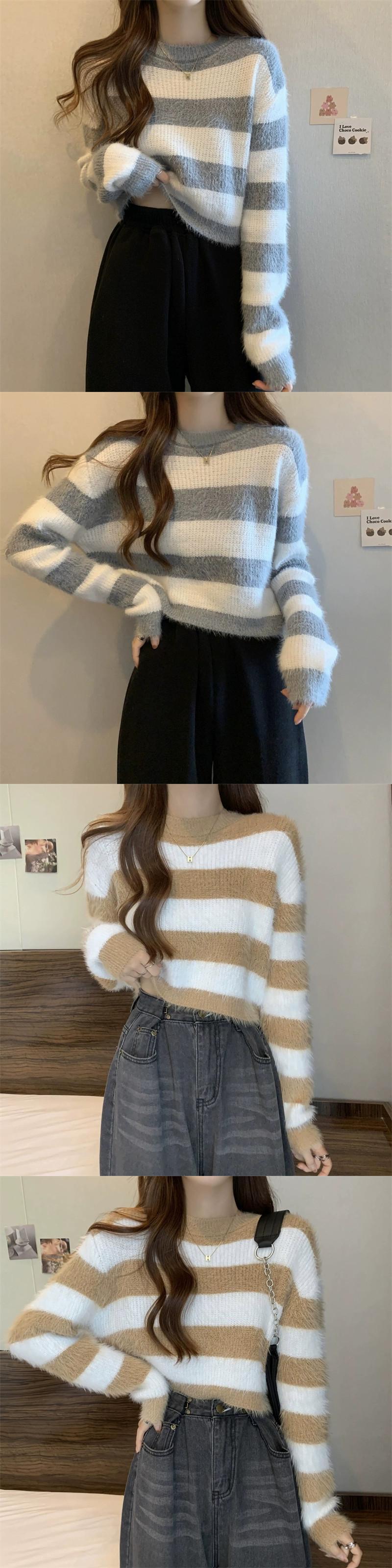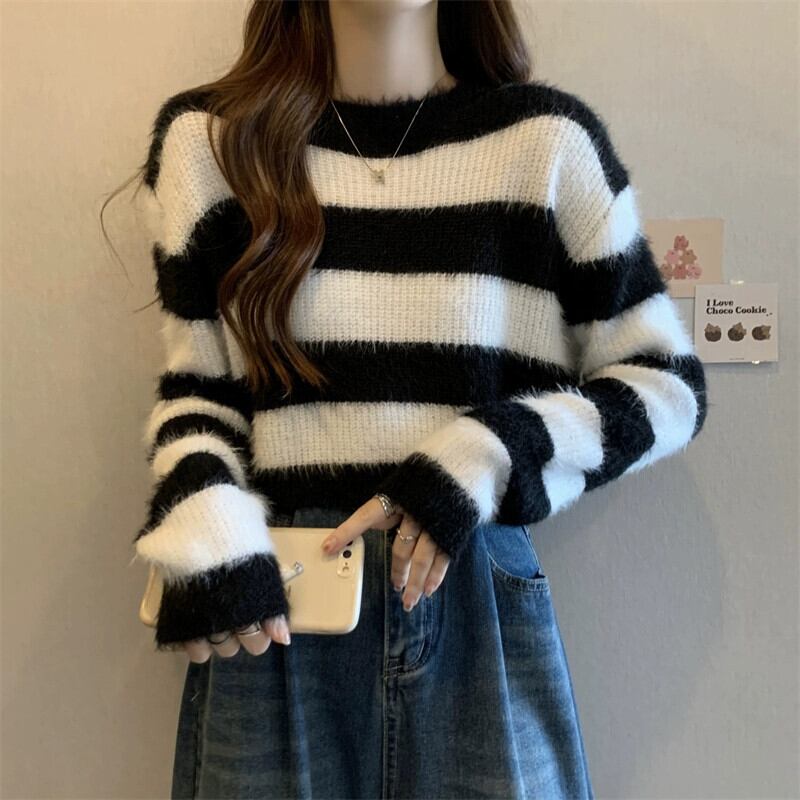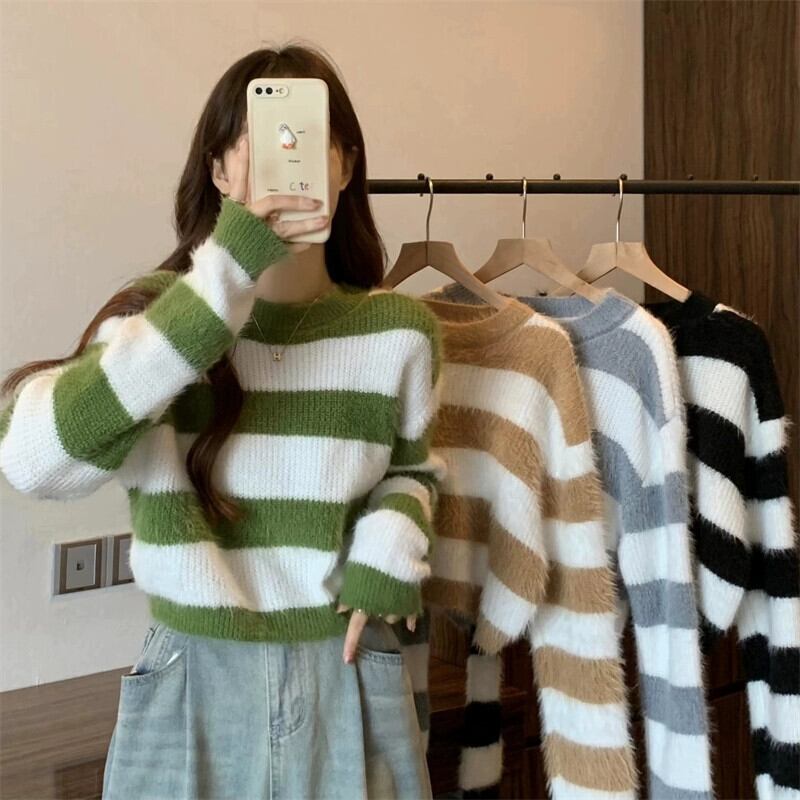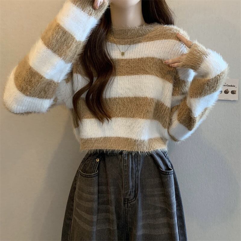 ストライプショートセーターレディース春の新スタイル小さなデザインセンスニッチレトロ超格好良いニットセーター スプリング 春物 8571689944345031