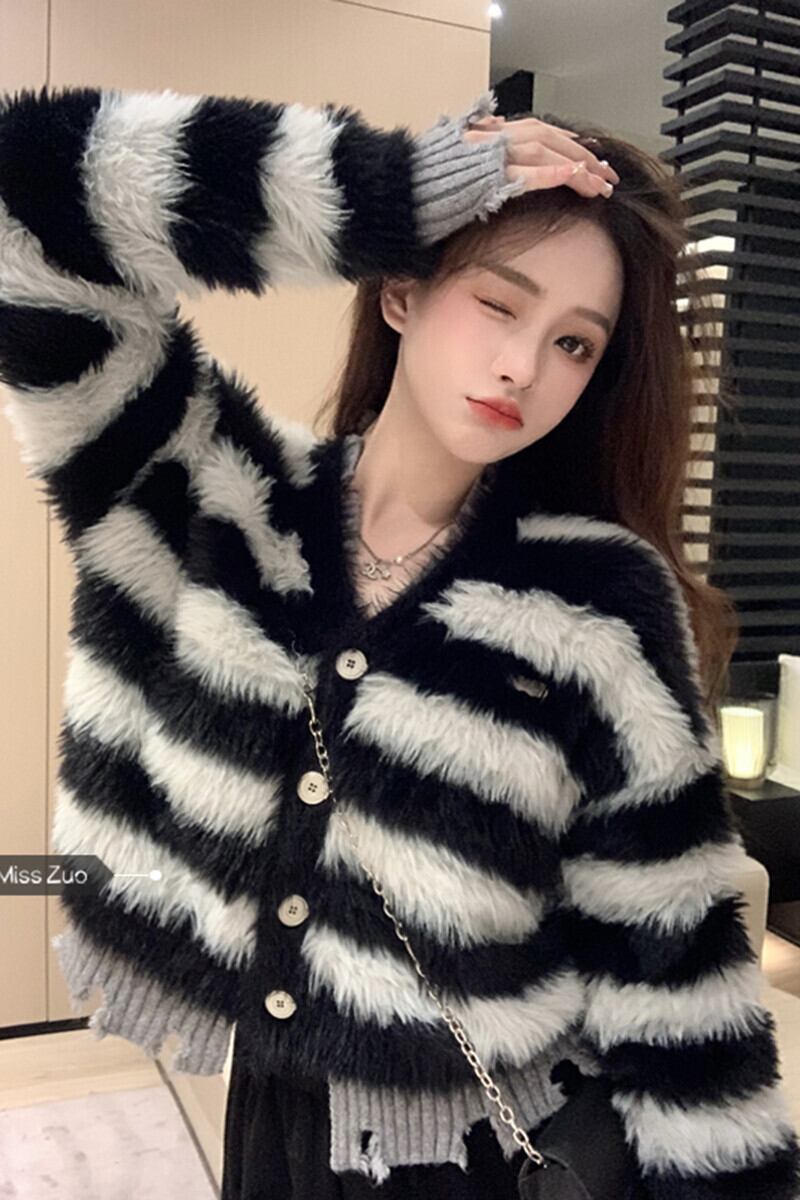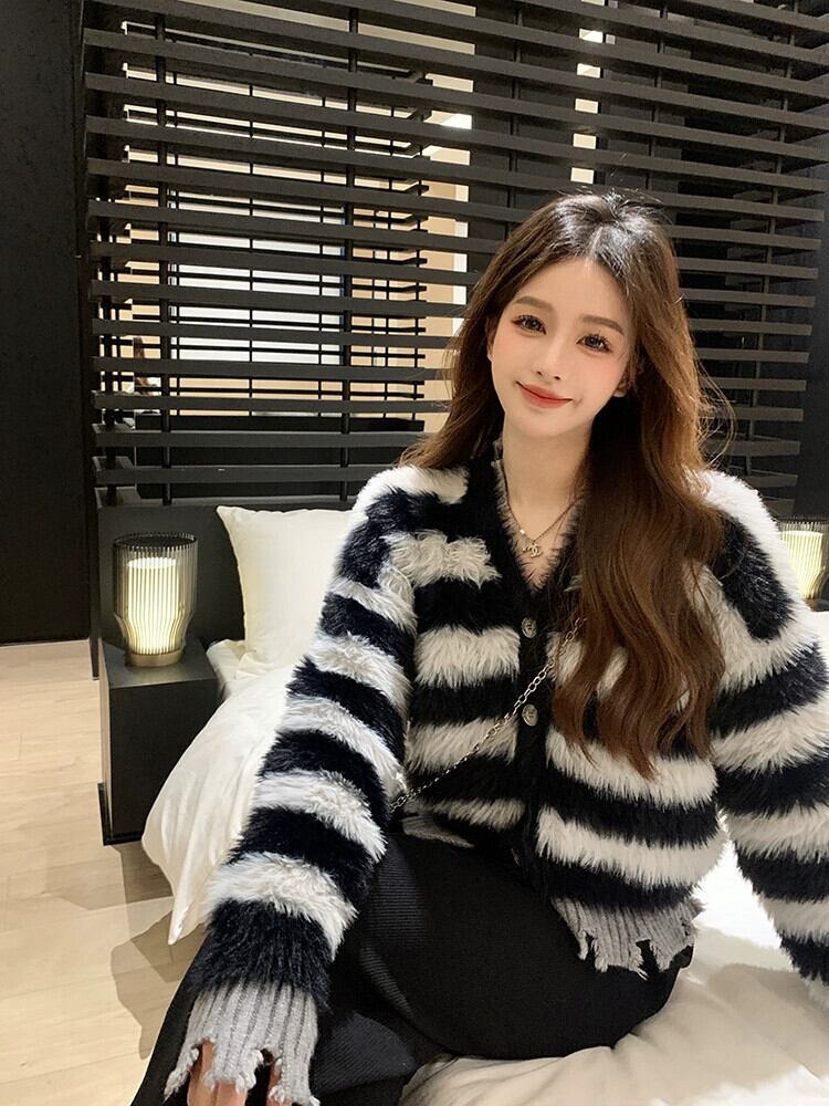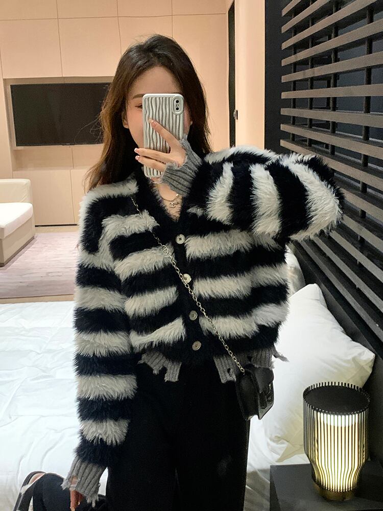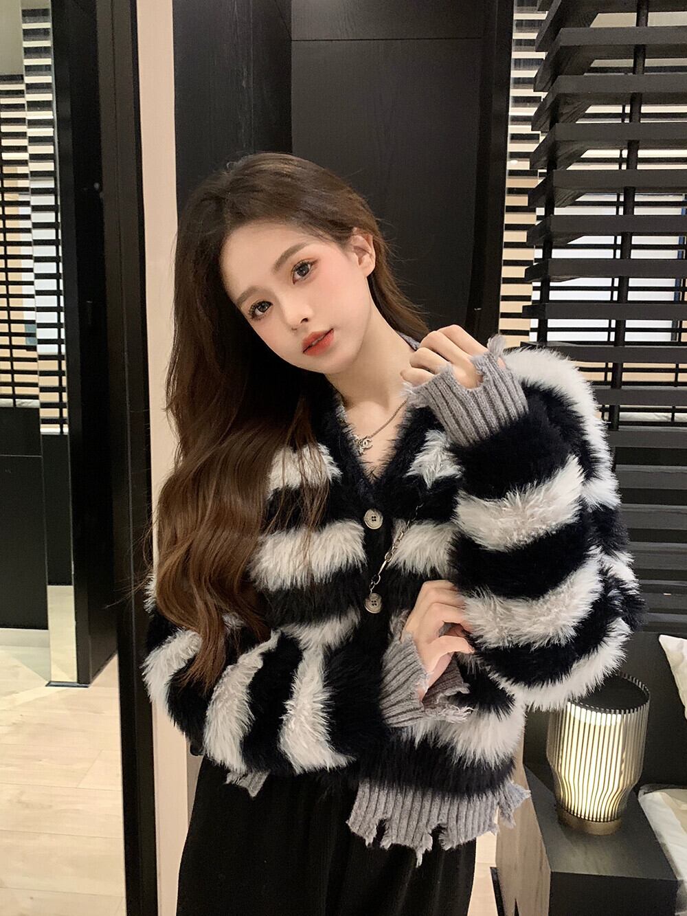 模造ミンクベルベットストライプセータージャケット女性の春 2023 新しい緩いレトロな怠惰な V ネックニットカーディガン スプリング 春物 Vネック 8571649957250397