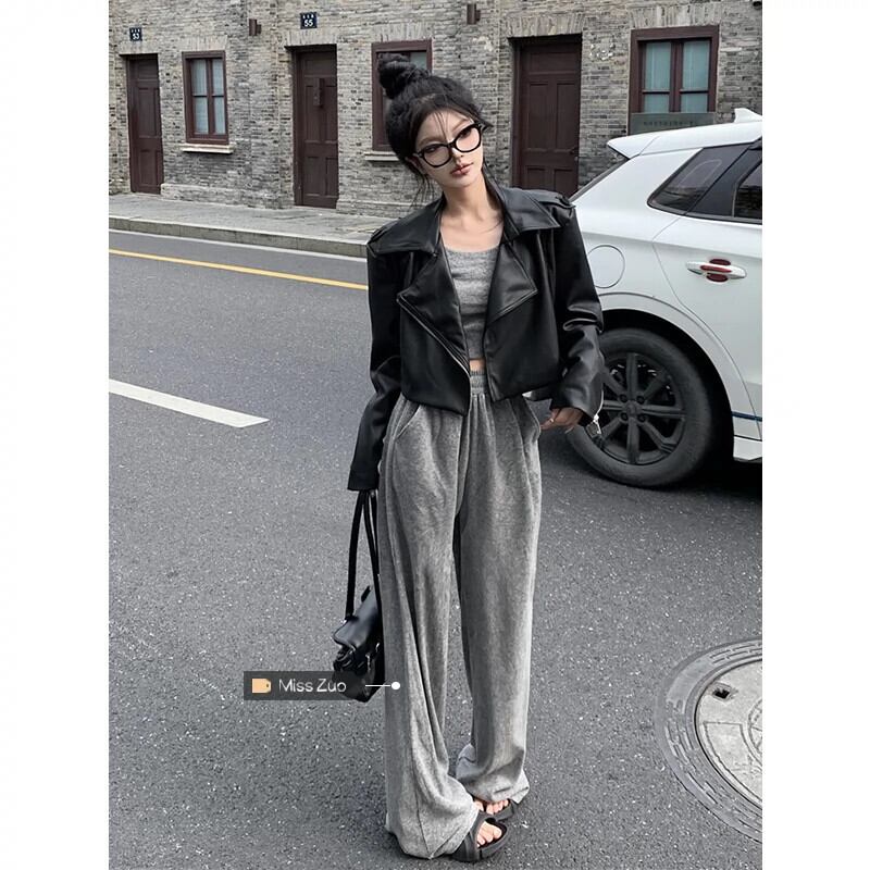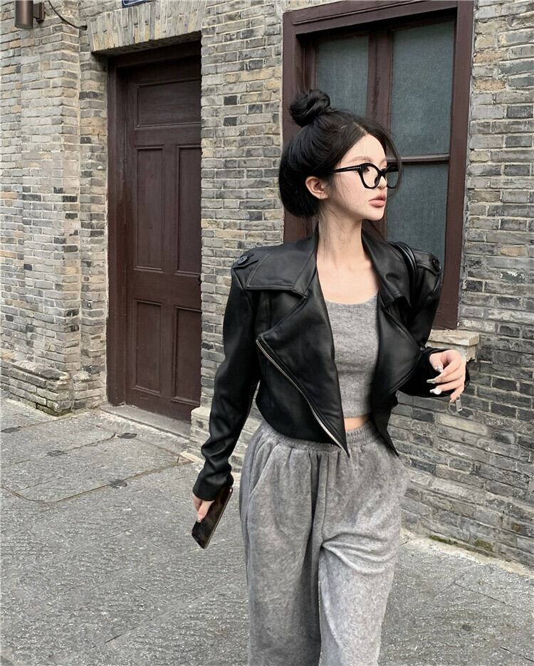 黒のショートレザージャケット女性 2023 春の新デザインセンス小型オートバイスーツレトロ pu レザージャケット ブラック スプリング 春物 857161526840524