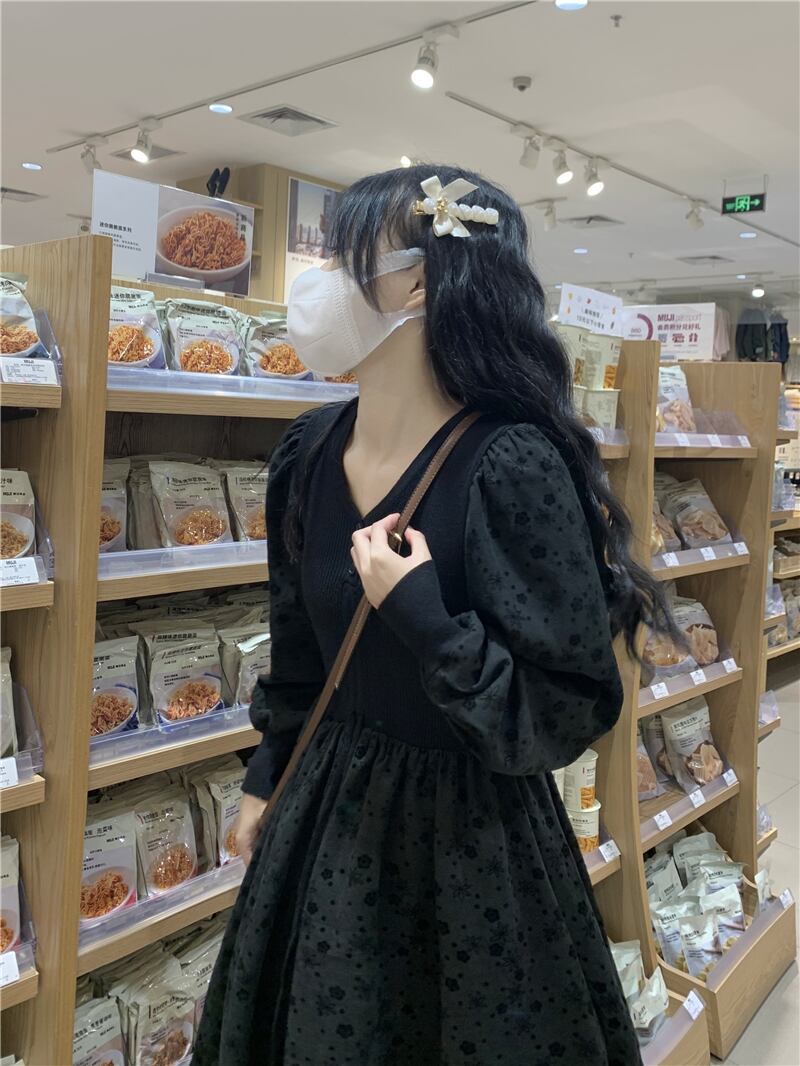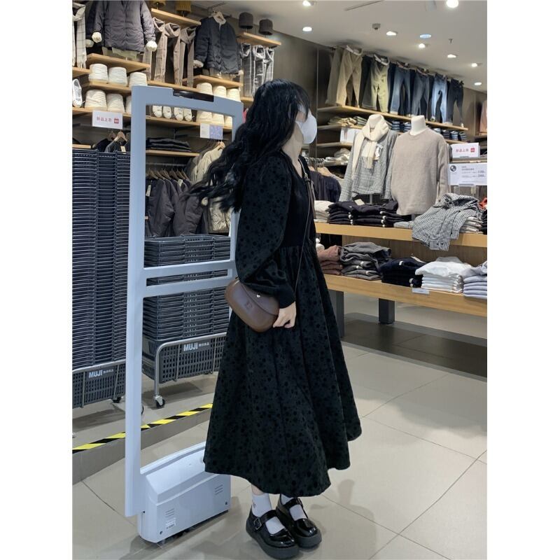 ヘップバーンスタイル黒長袖ドレスの女性の秋と冬のデザインセンスニッチ 2023 新しいフレンチレトロウエストスカート ロング ブラック オータム 秋物 ウィンター 冬物 8571687583169521