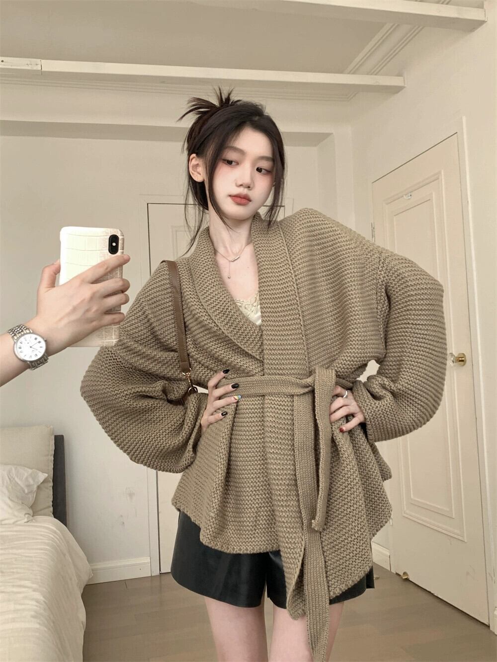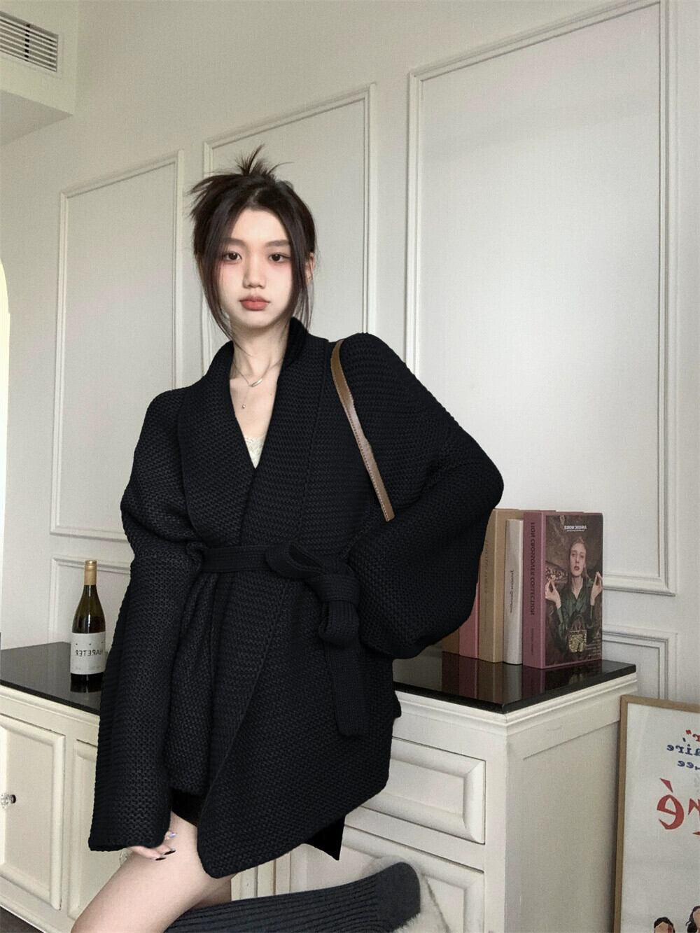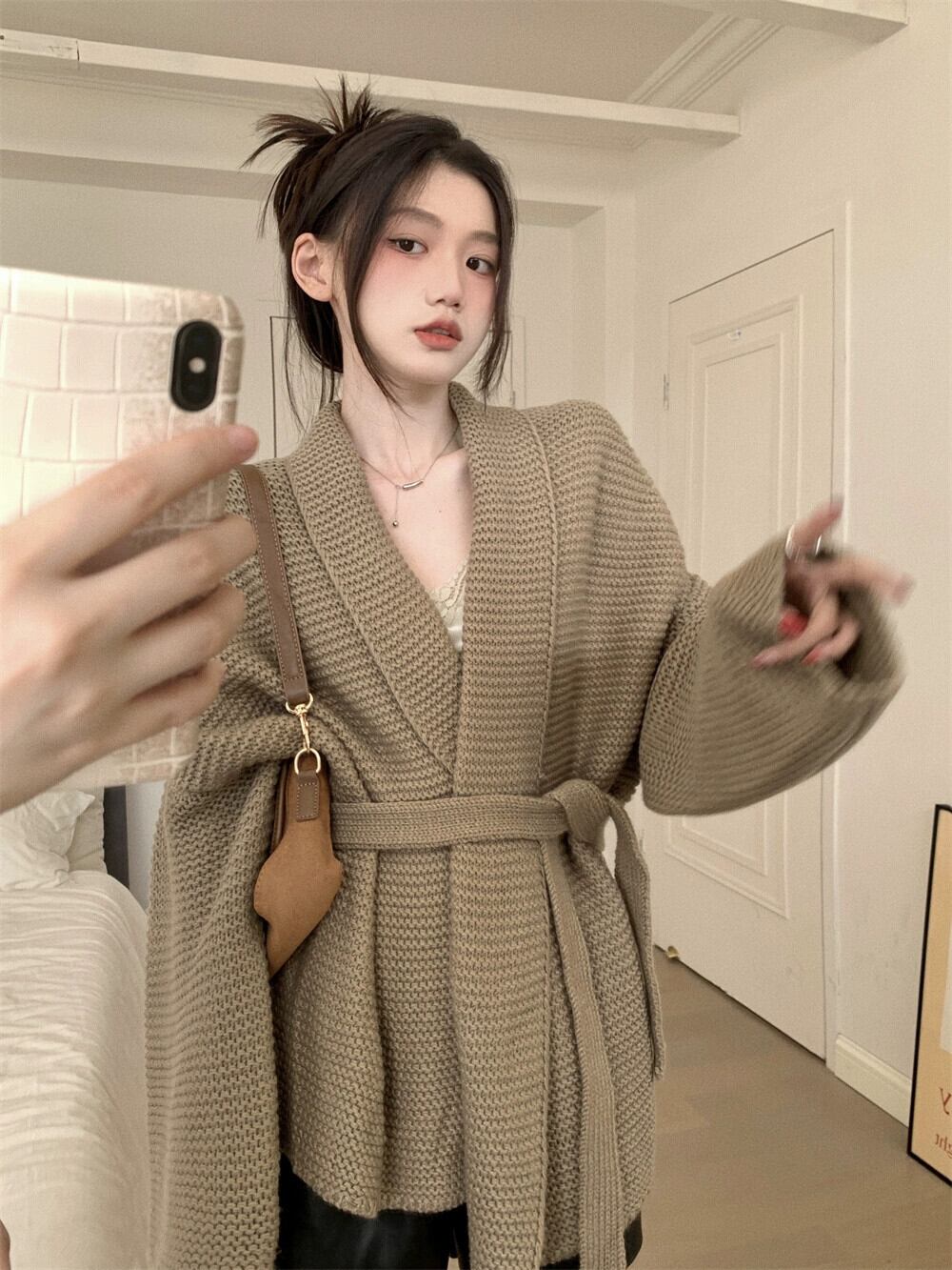 V ネックセータージャケット女性の秋冬ルーズアウター 2023 新しい怠惰なスタイルの高品質ストラップニットカーディガン オータム 秋物 ウィンター 冬物 Vネック 8571655229070238