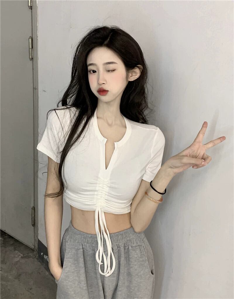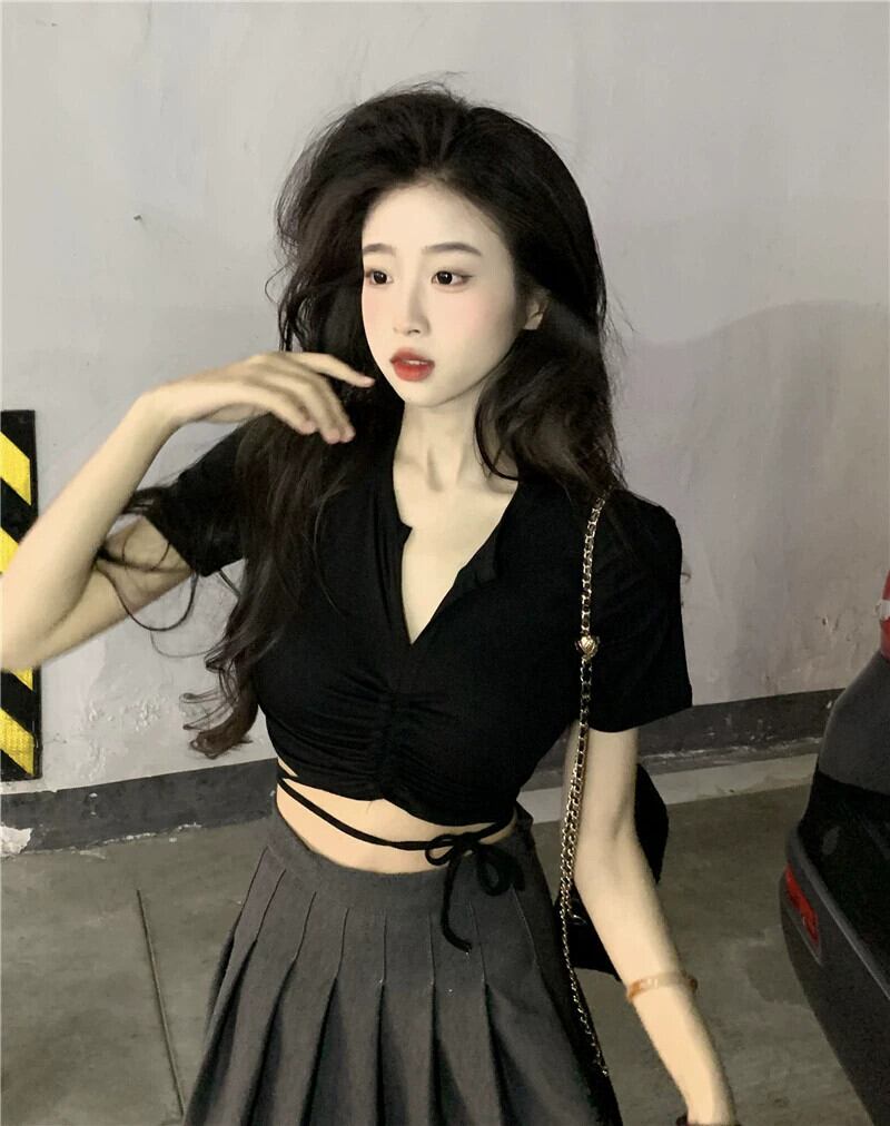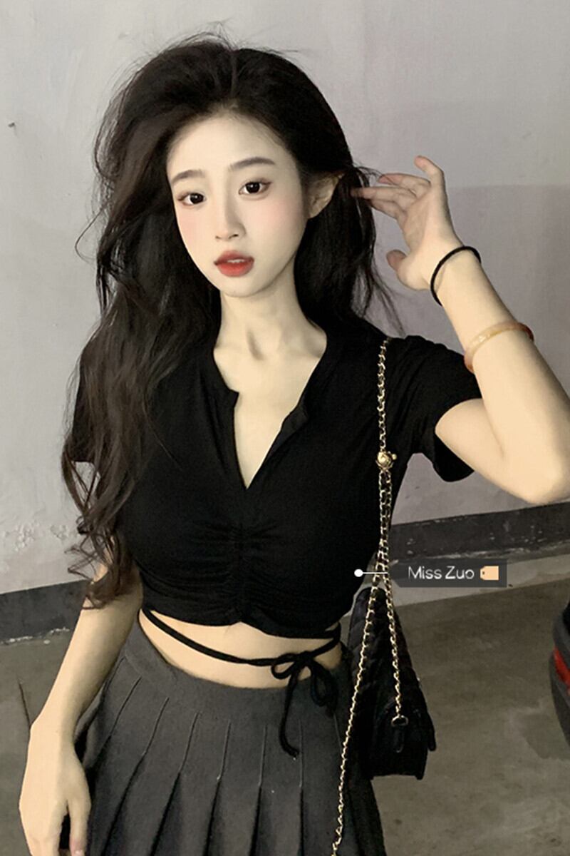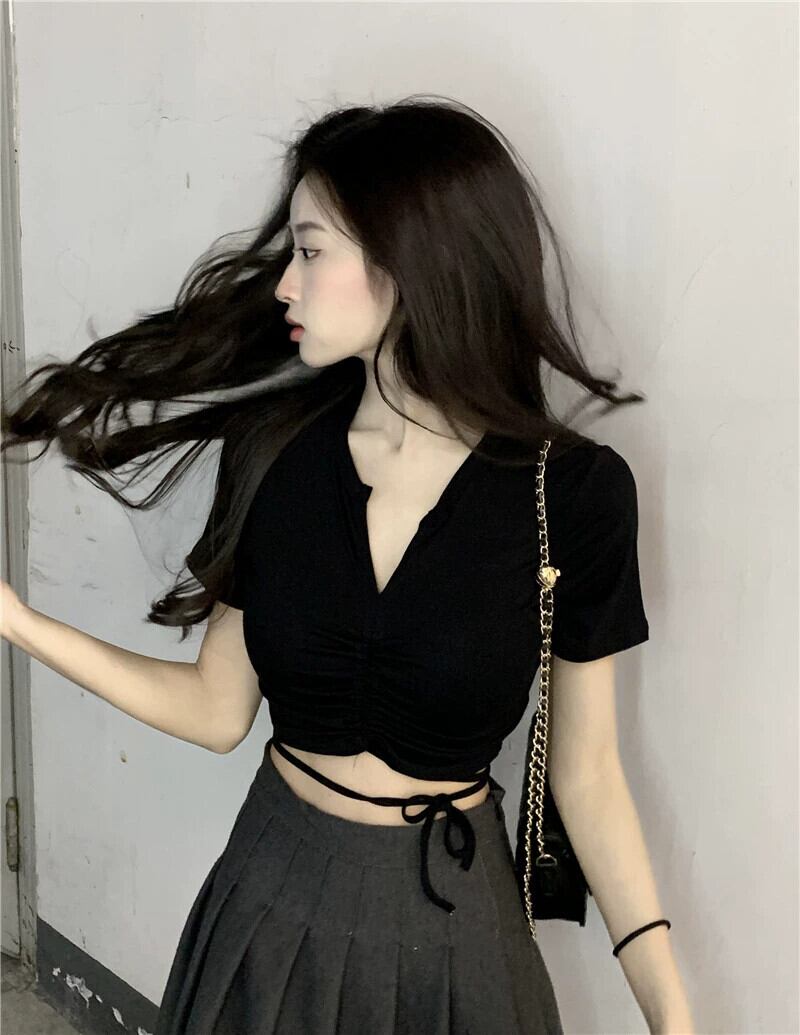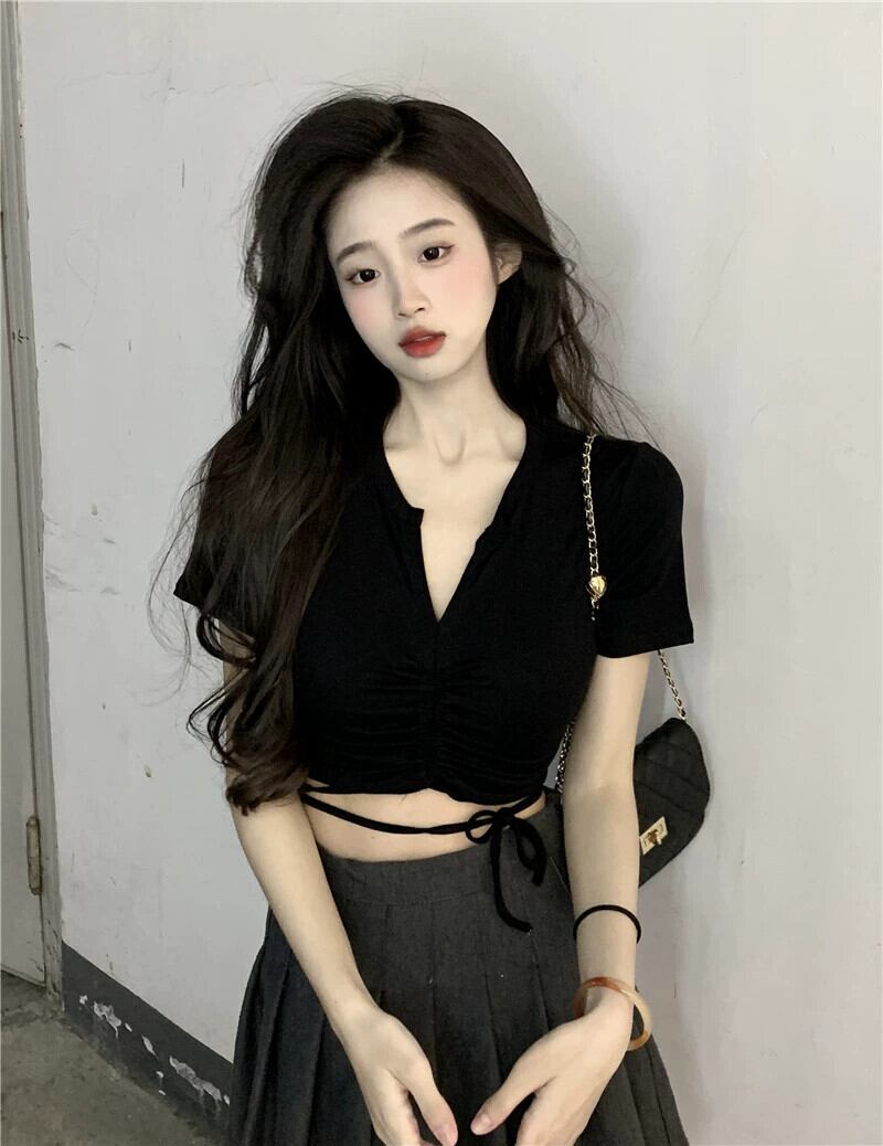 ブラックフロントショルダー半袖Tシャツレディースデザインセンスニッチ夏純粋な欲望スリムフィットへそ巾着ショートトップ サマー 夏物 ピュア 8571628362472397