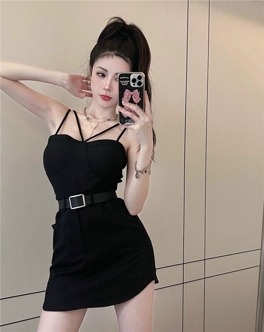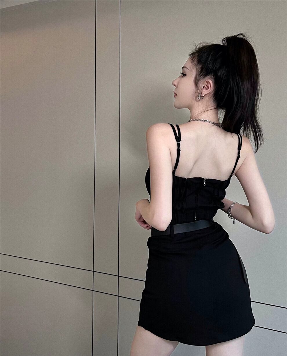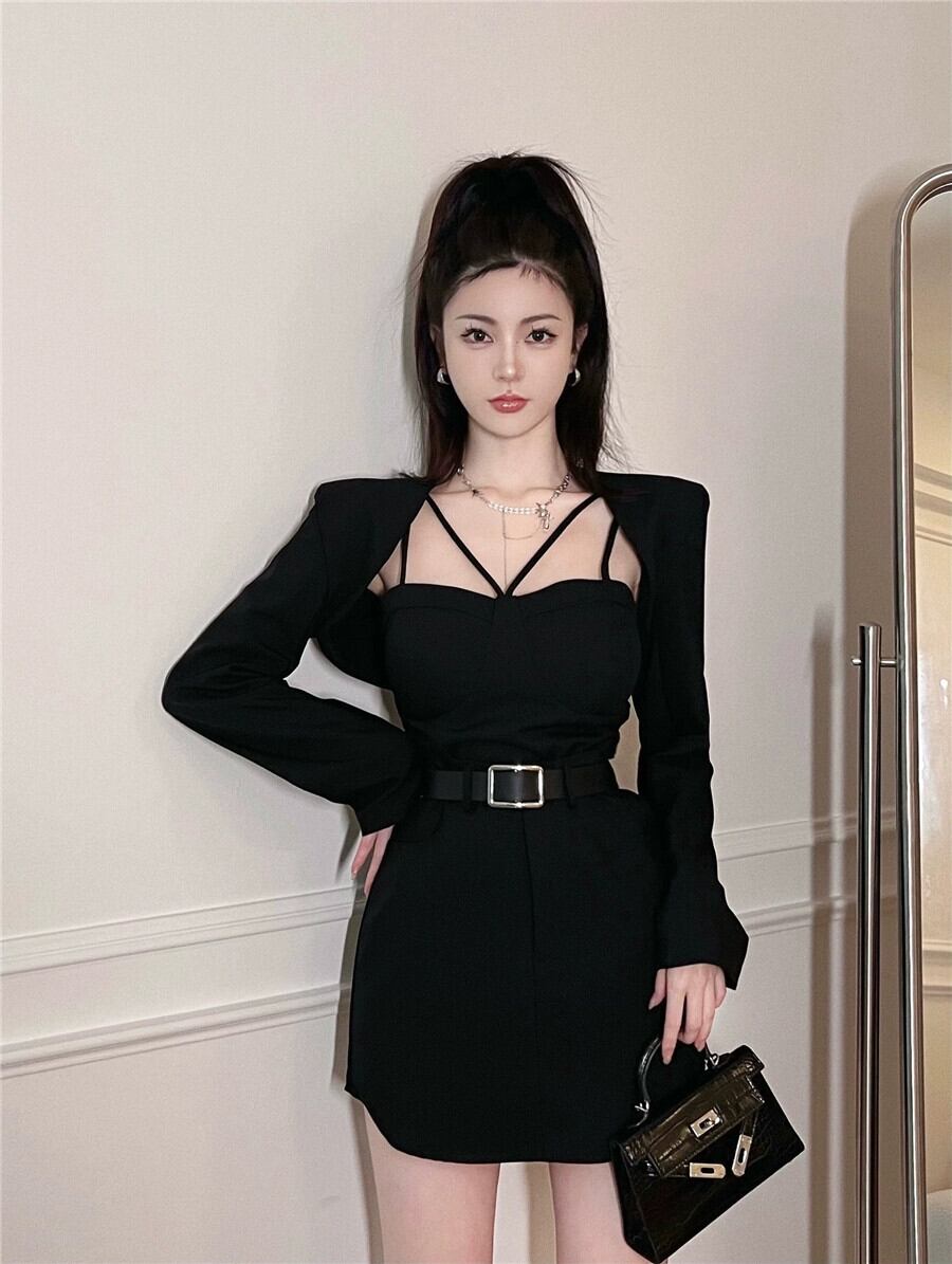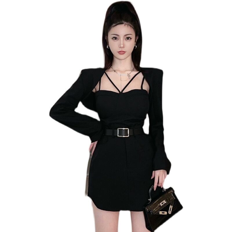 黒のスーツジャケットの女性のサスペンダーとショール外側 2023 春の新しいニッチシックなユニークなショートトップ ブラック スプリング 春物 8571684373432733
