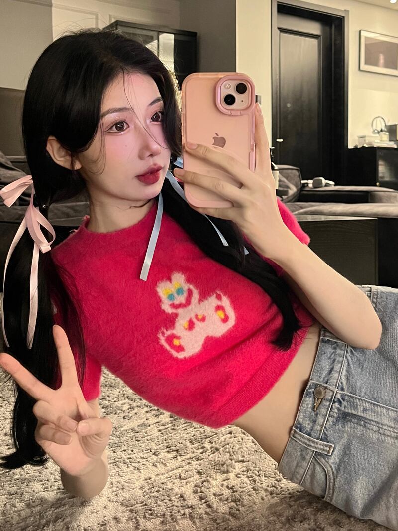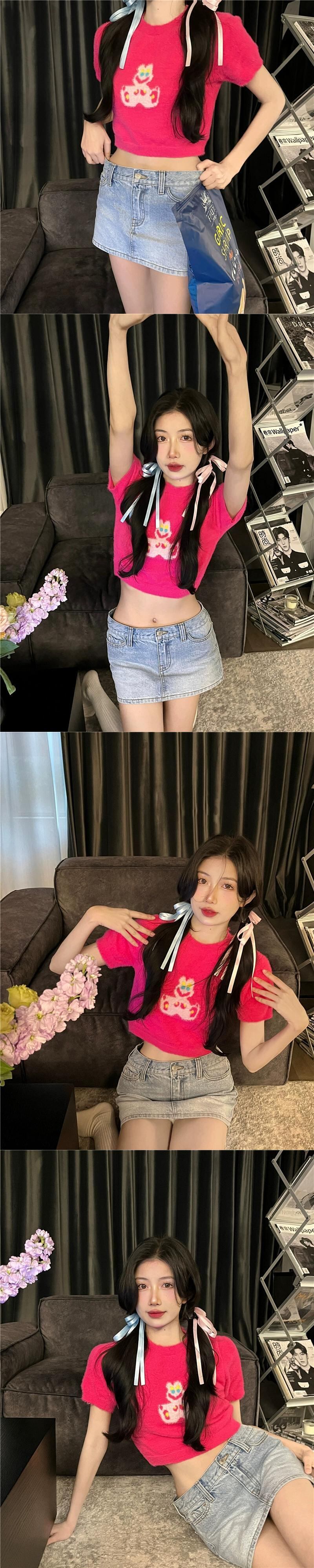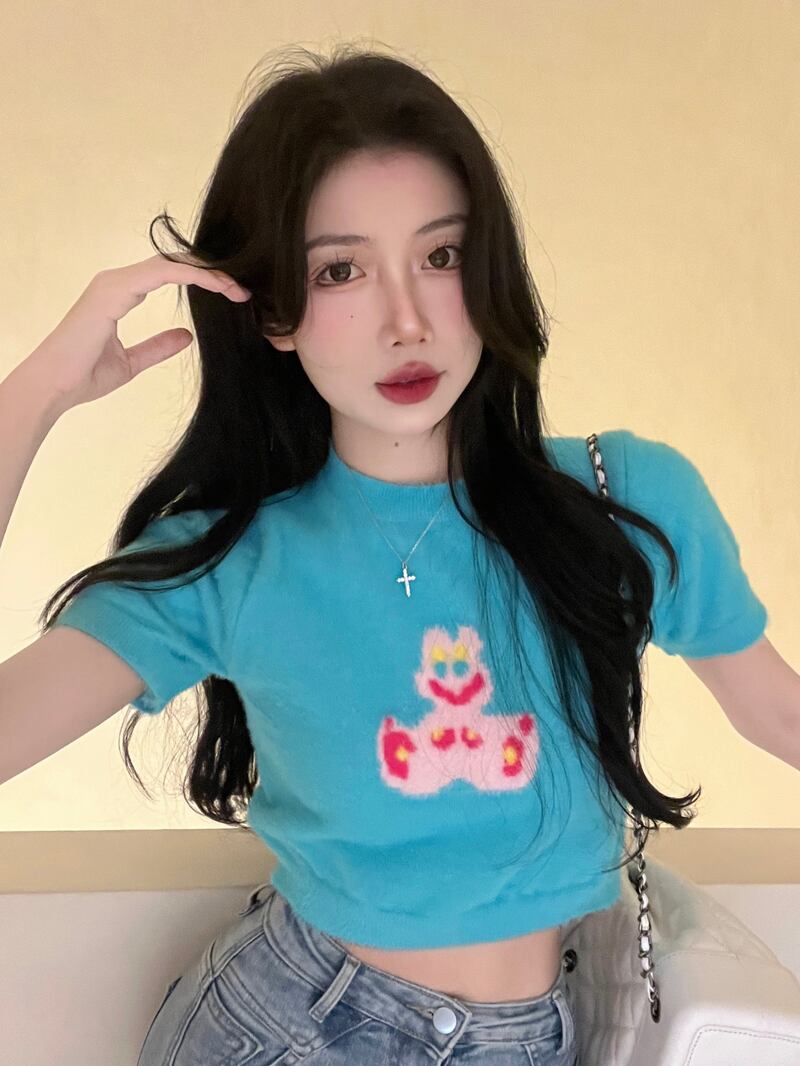 ローズピンクのニット半袖レディース夏のデザインセンスはユニークでユニークで、純粋な欲望の甘いスリムショートトップです 大人ガーリー スウィート キュート カジュアル サマー 夏物 ピュア 8571685680907523