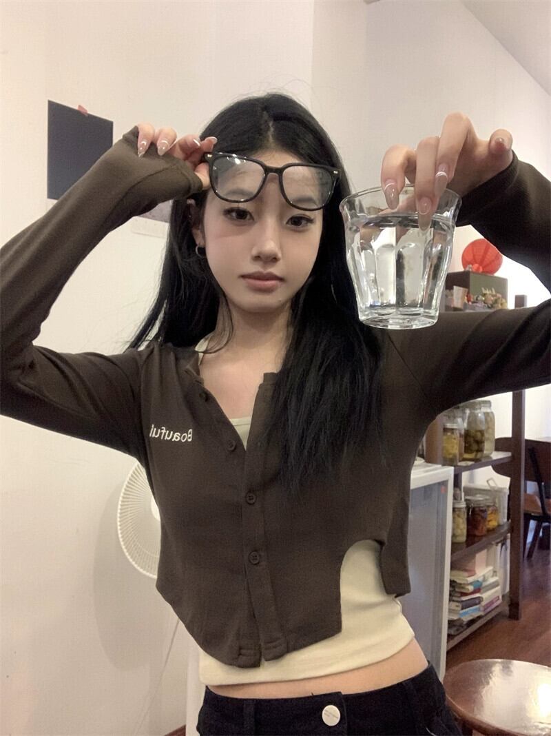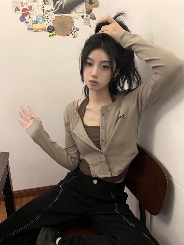 ショートトップ 2 点セット女性の春の新しいユニークなシックなハイウエストタイトなアメリカンレトロ長袖 T シャツ ハイウェスト ロング スプリング 春物 Tシャツ 8571621925990084