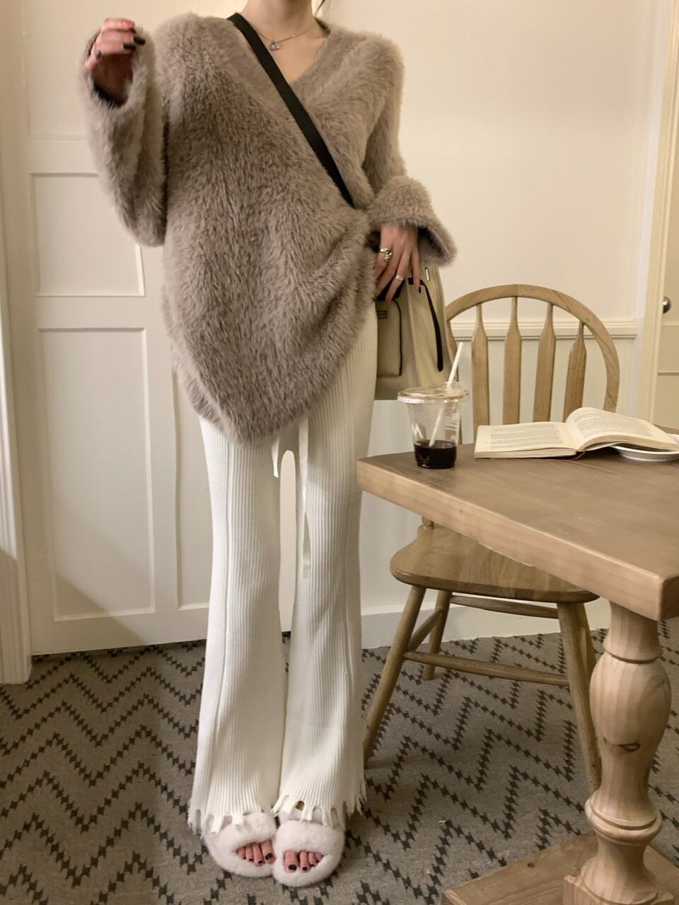 色:ミンクのセーター,フレアニットパンツ