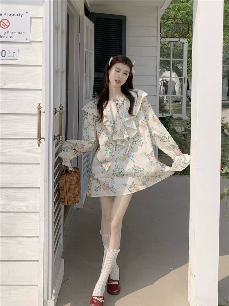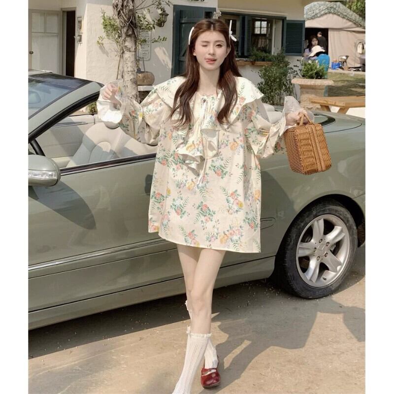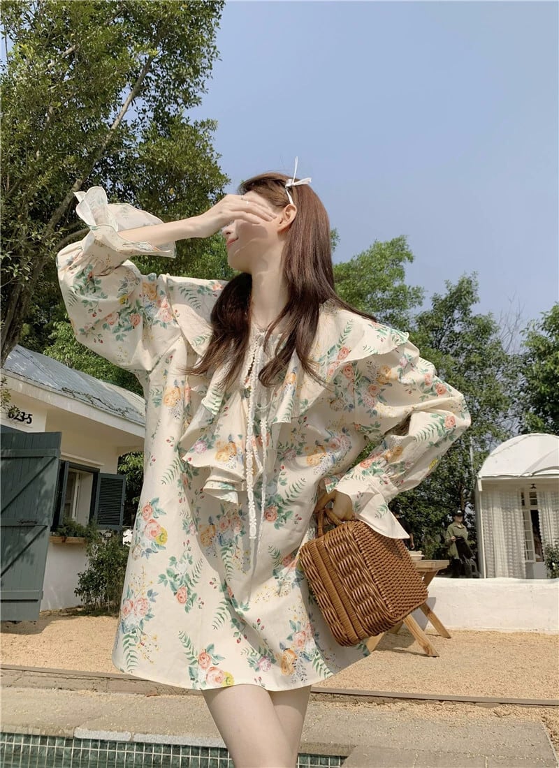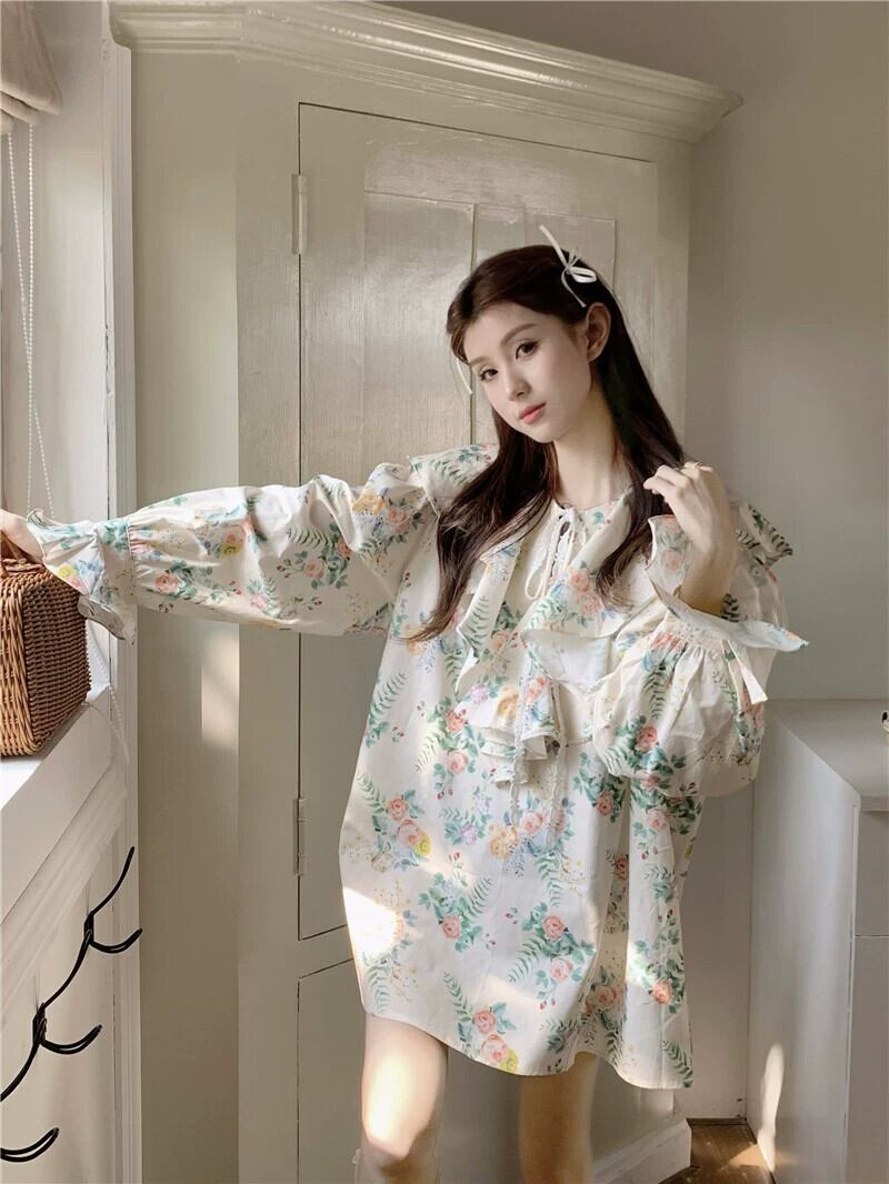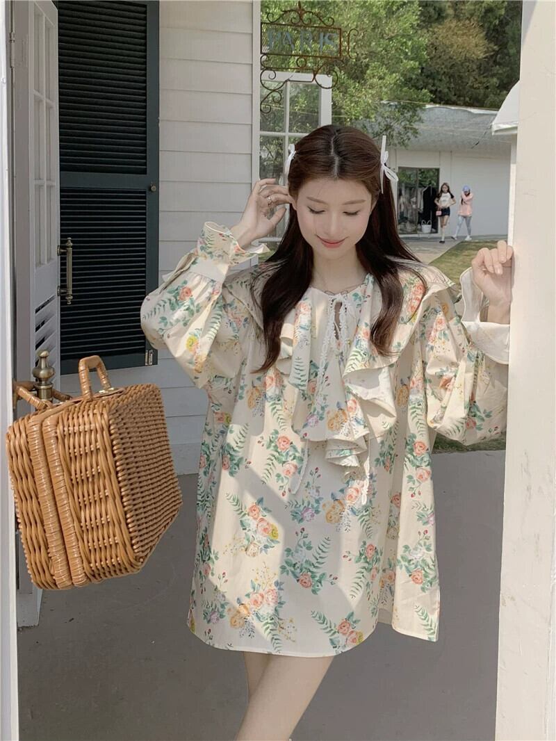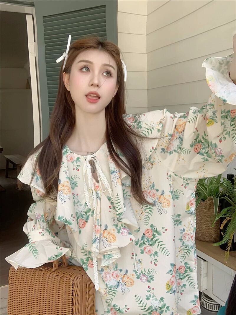フリルトップ婦人服デザインセンスニッチ2023春新スタイル甘くて美しい長袖花柄シャツ ロング 大人ガーリー スウィート キュート カジュアル スプリング 春物 8571666509283670