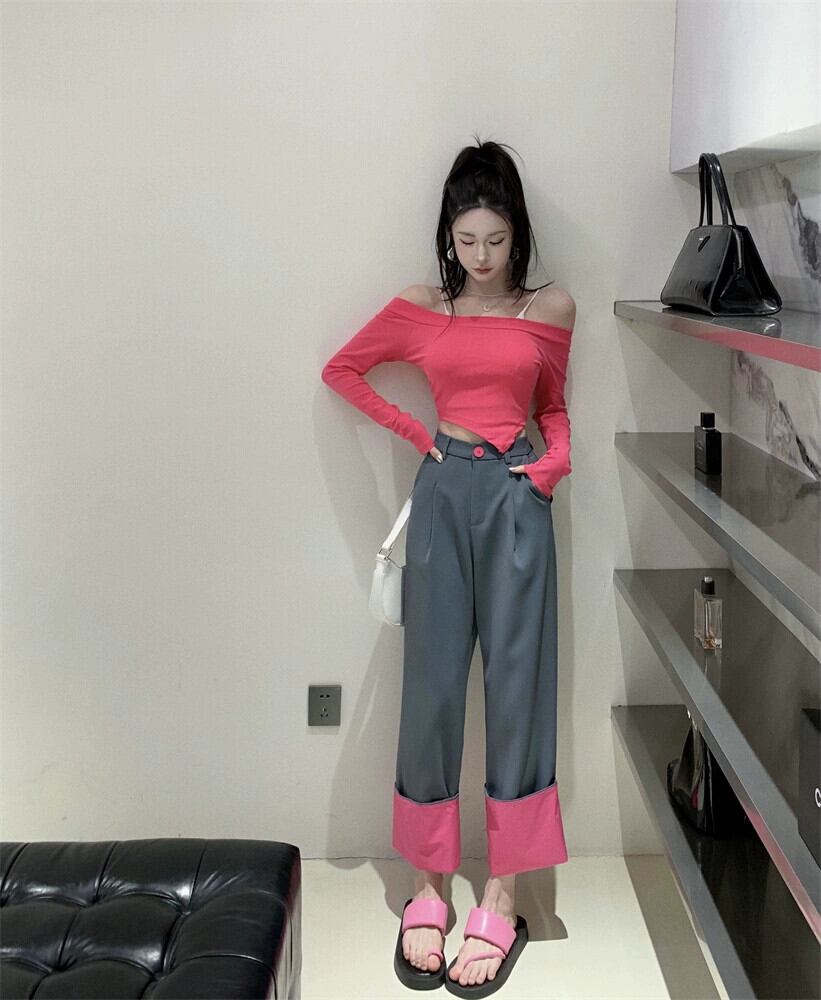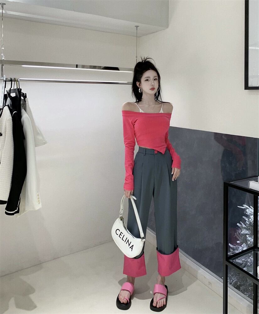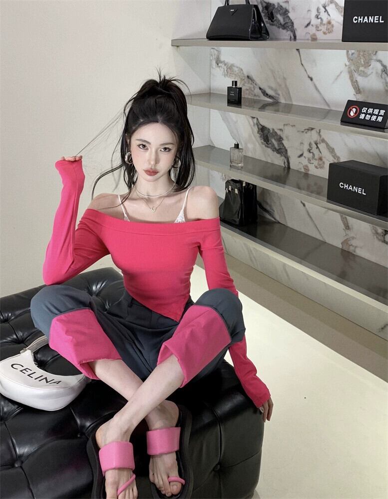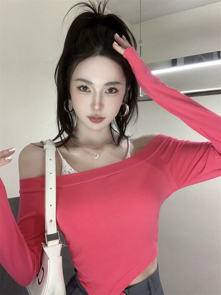 ワンショルダー不規則ショートトップレディース2023春新作セクシースリムローズレッド長袖Tシャツ ロング スプリング 春物 857169923205818