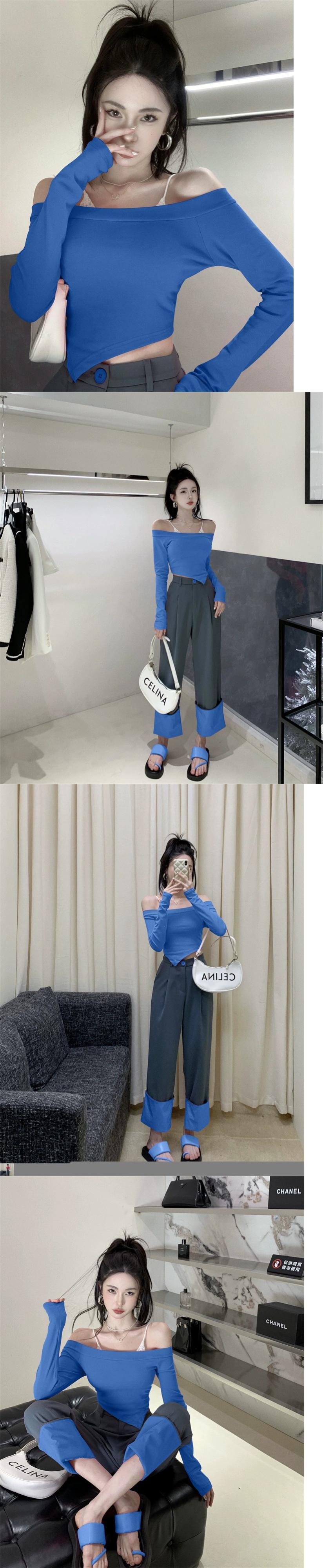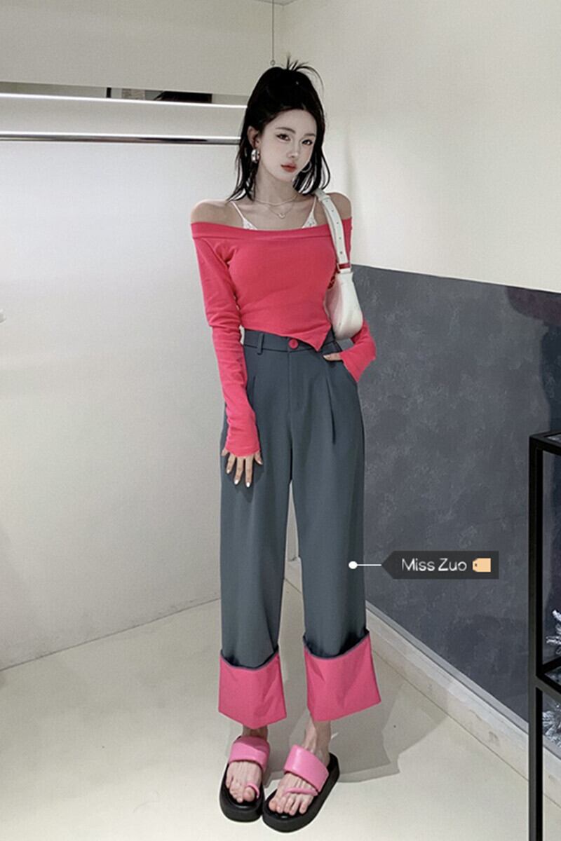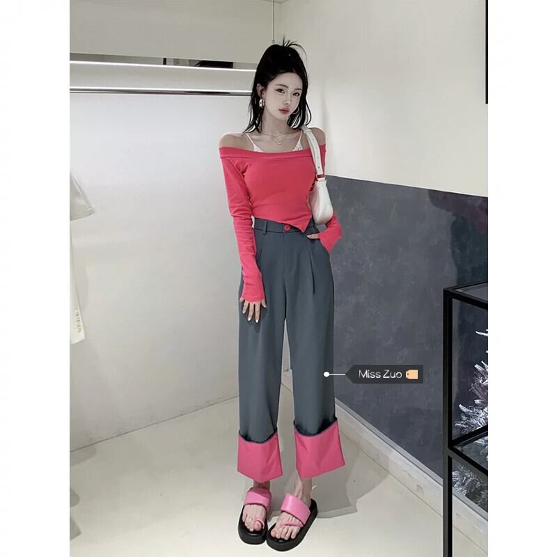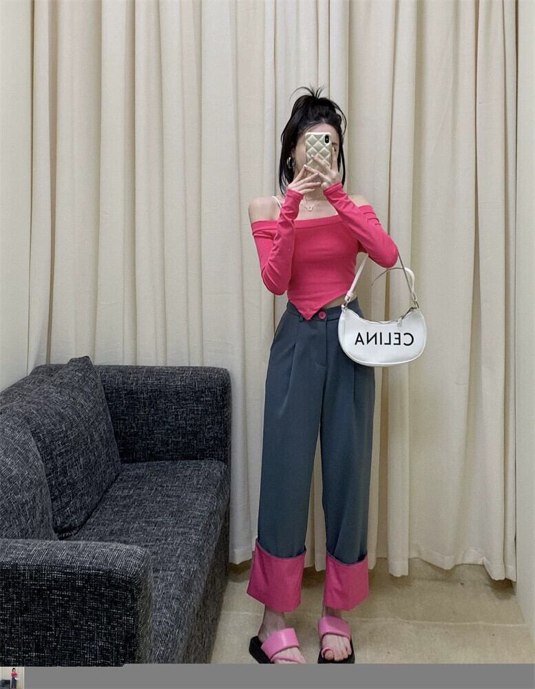 ワンショルダー不規則ショートトップレディース2023春新作セクシースリムローズレッド長袖Tシャツ ロング スプリング 春物 857169923205818