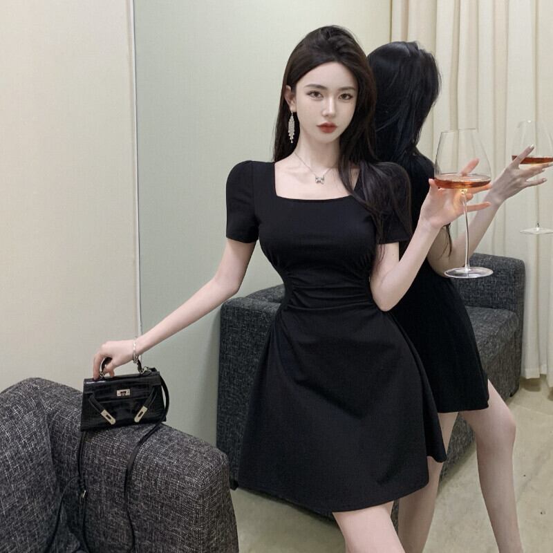 スクエアカラードレスの女性の夏フレンチヘップバーンスタイルリトルブラックドレス 2023 新しい気質ハイエンド感覚ウエストショートスカート サマー 夏物 スクウェア 8571615558526018