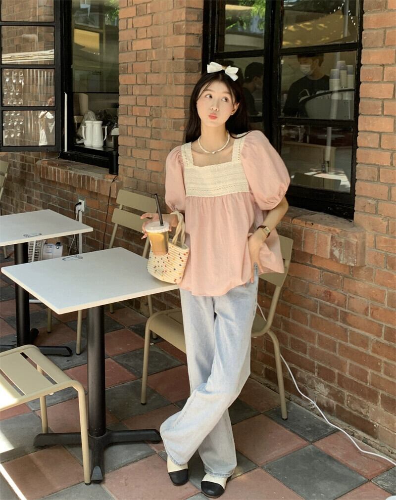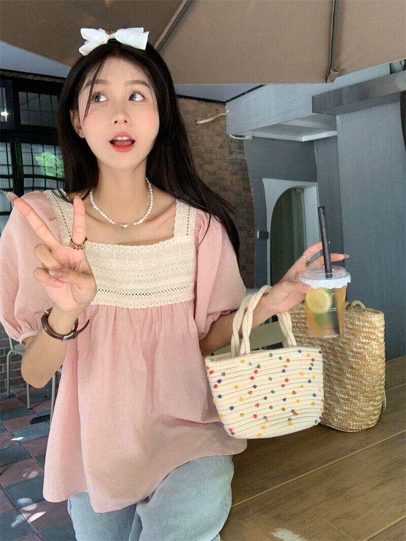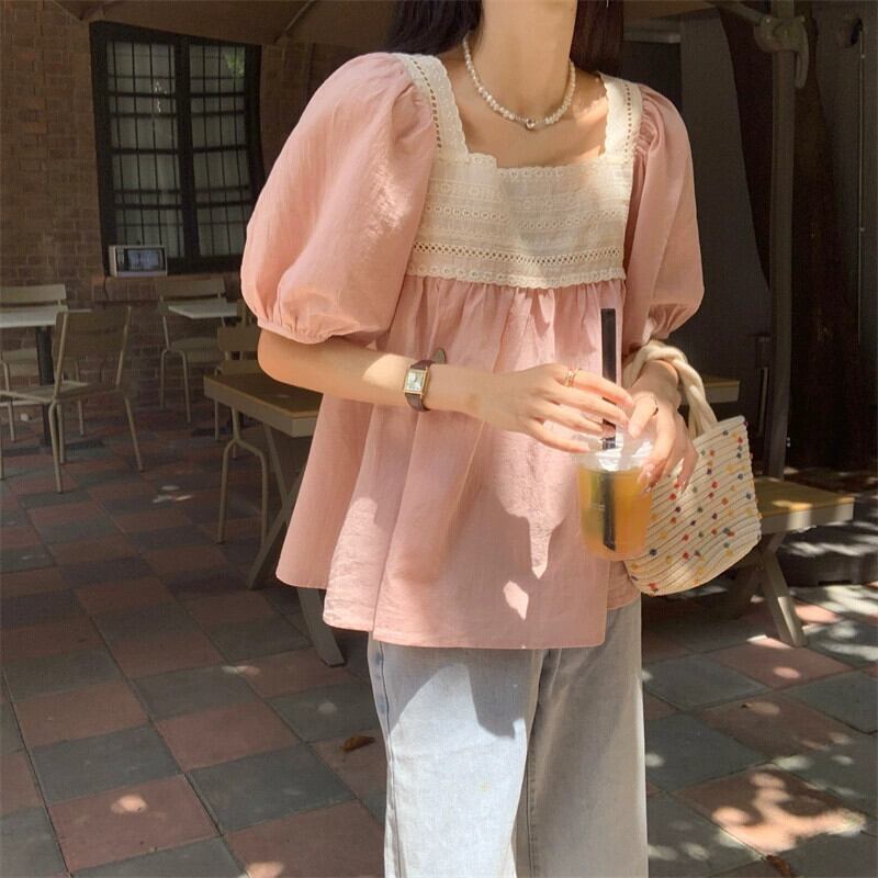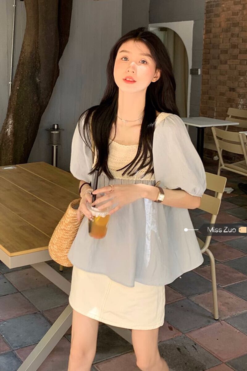 ブルーパフスリーブ半袖シャツレディース2023年夏新デザインセンスニッチフレンチスウィートドールシャツトップ 大人ガーリー キュート カジュアル サマー 夏物 8571678995747458
