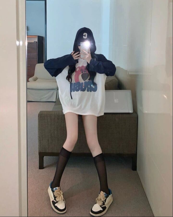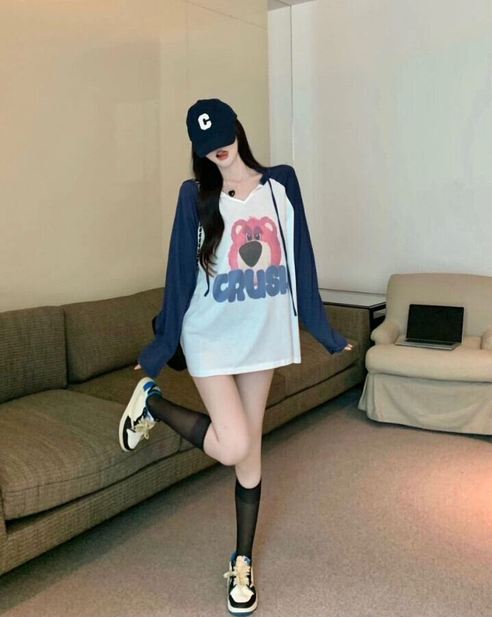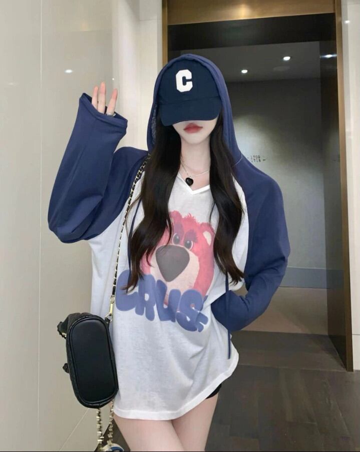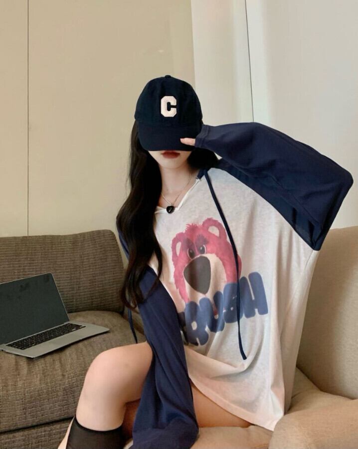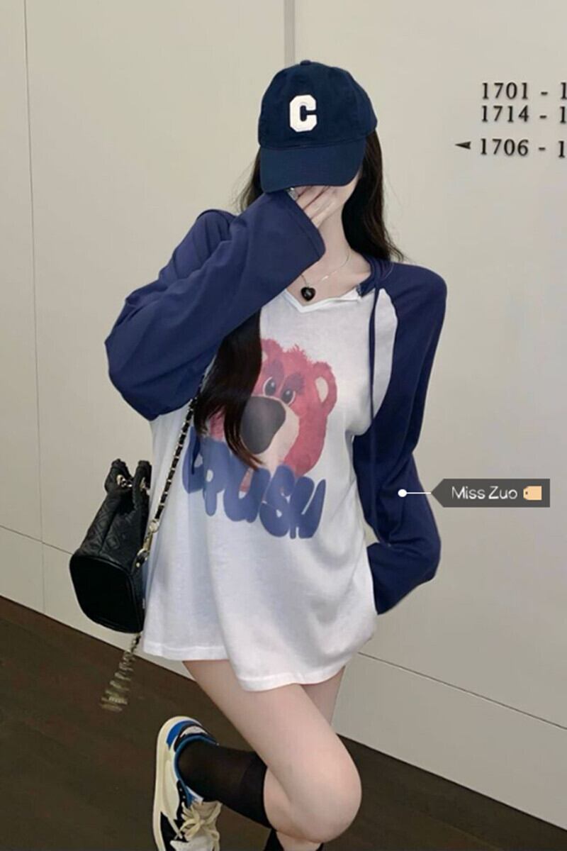 ベア フード付き 長袖 Tシャツ レディース 2023 春新作 デザイン感 ニッチ ミドル丈 ボトム ボトム欠 トップ ロング スプリング 春物 8571644690802652