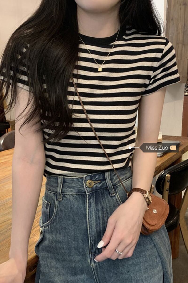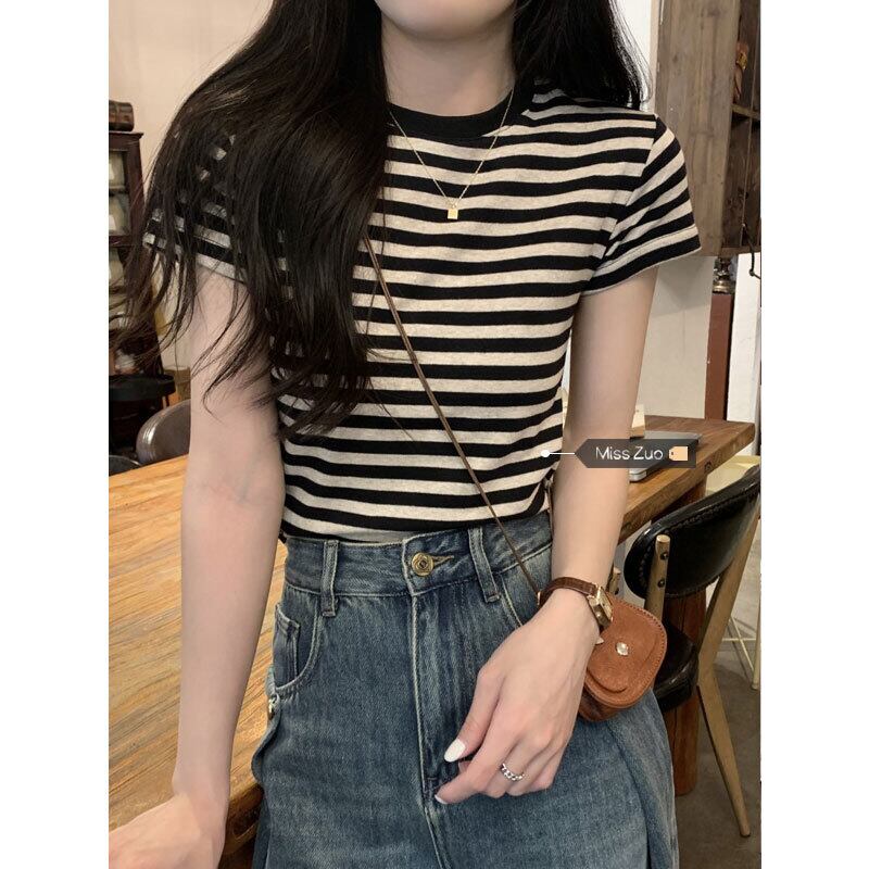 ストライプ半袖 Tシャツ女性小男性夏 2023 新しいデザインセンスニッチスリムスリムショルダー服 サマー 夏物 8571672241165097