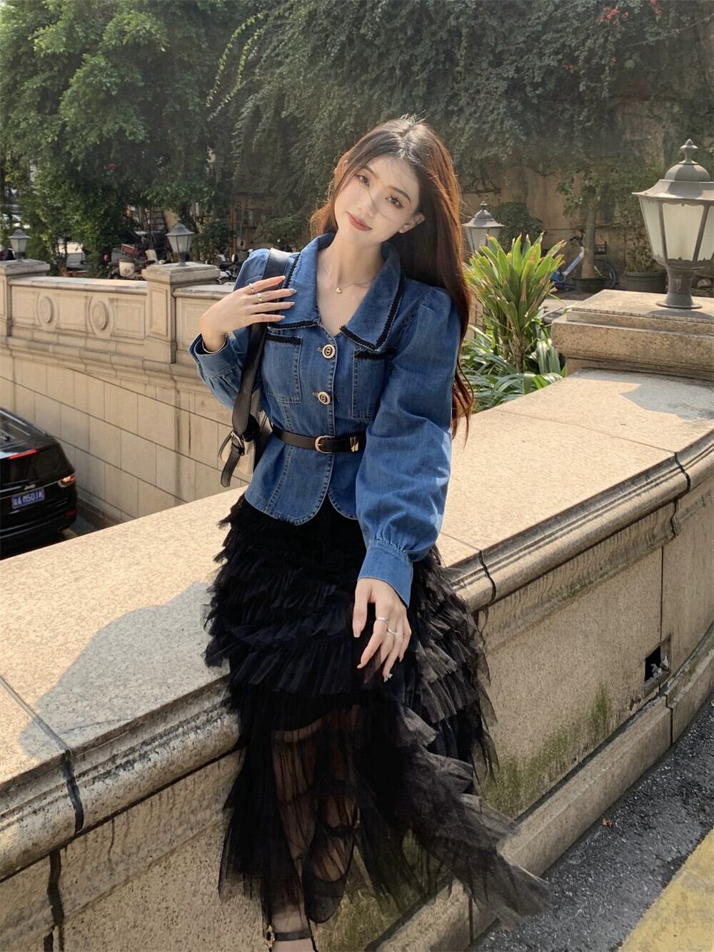 ウエストデニムシャツ女性の2023春の新しいデザインセンスニッチフレンチスタイル今年の人気爆発スタイル長袖トップ ロング スプリング 春物 8571686242886817