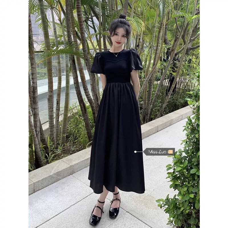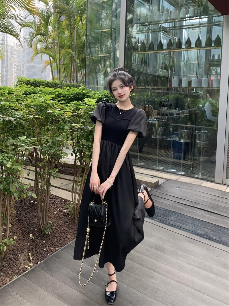 黒パフスリーブドレスレディース2023夏新作フランス気質優しい風先進感薄手ロングスカート ブラック サマー 夏物 8571615921374239