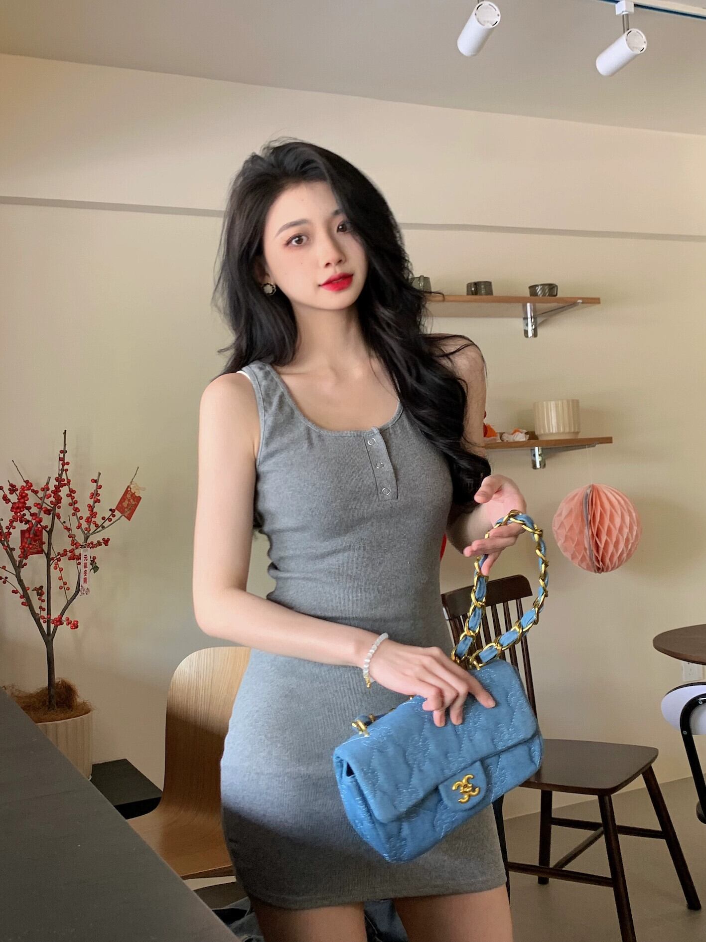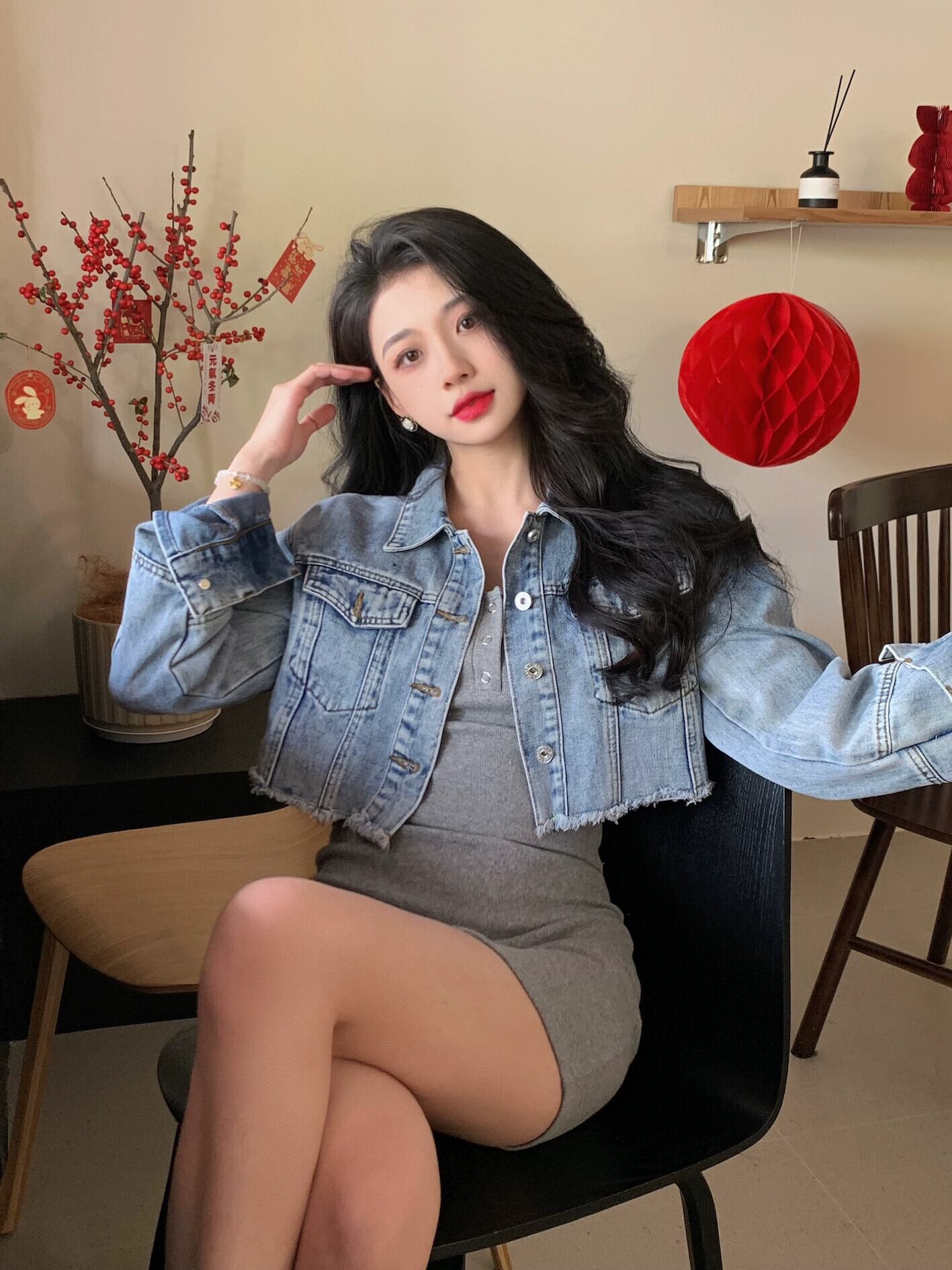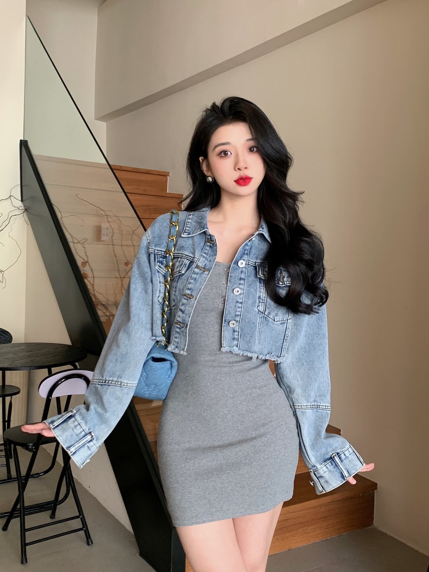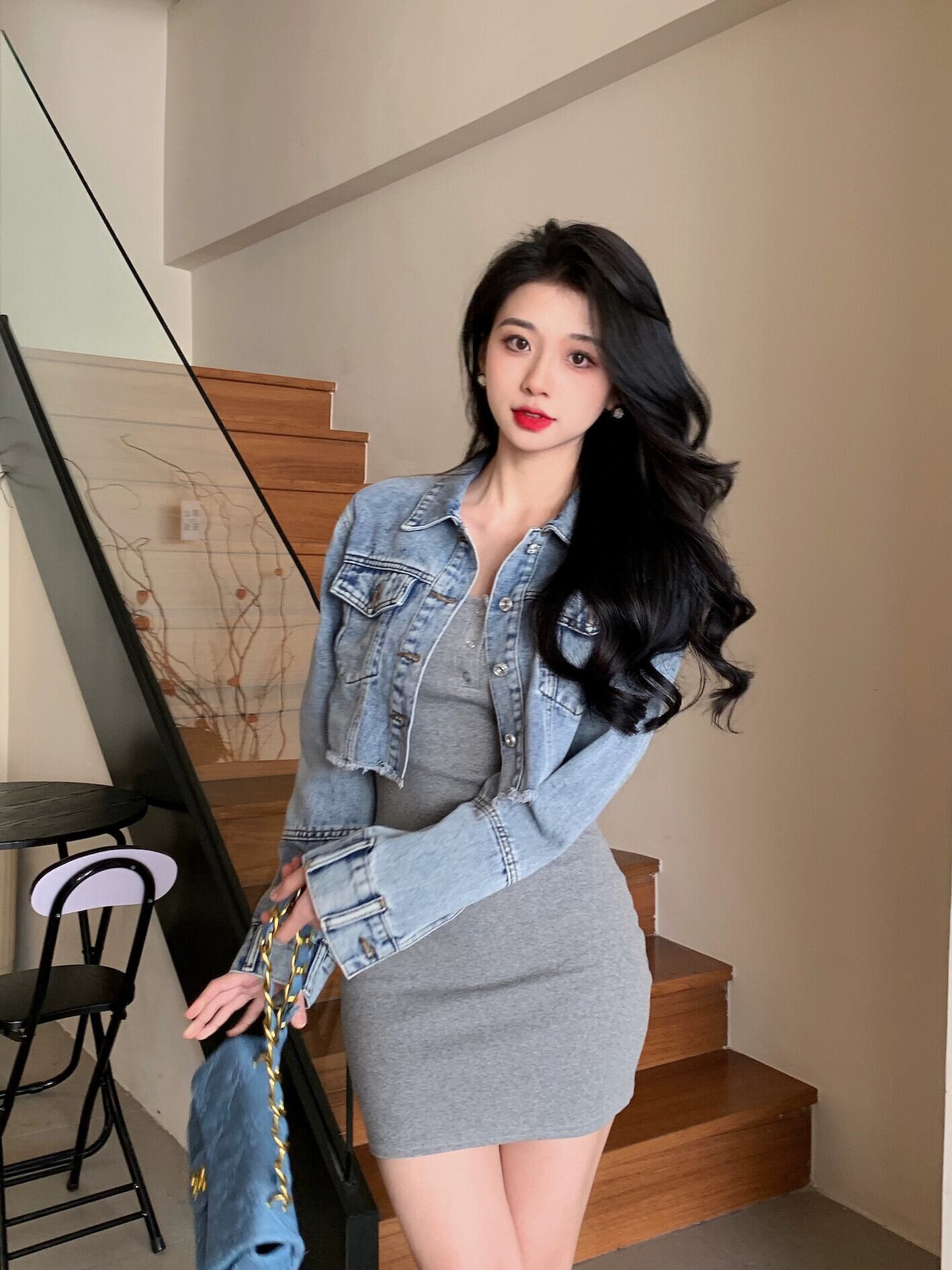 色:ジージャン,グレーニットスカート