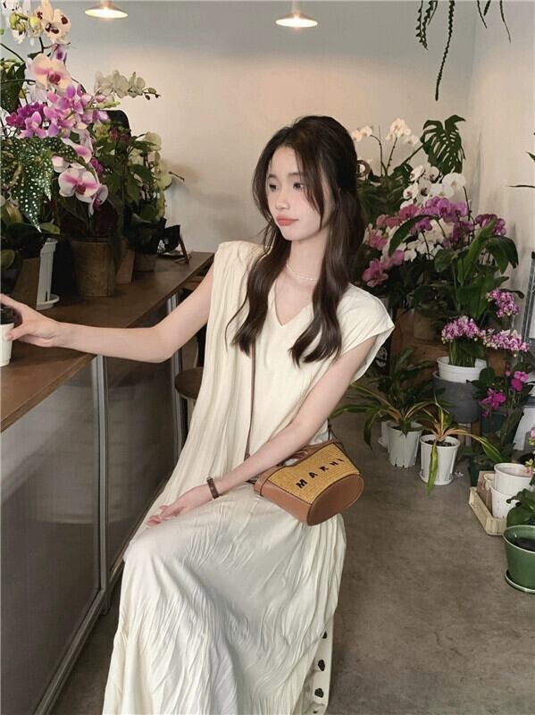 ノースリーブ V ネックドレスの女性の 2023 夏の新しいフレンチスタイルの優しいスタイルのハイエンドの梨型フィギュアロングスカート サマー 夏物 Vネック 8571631303359114