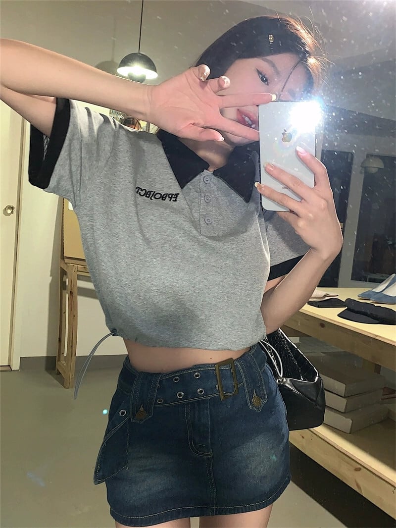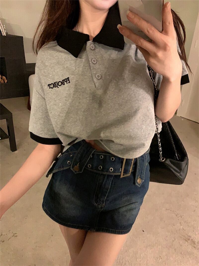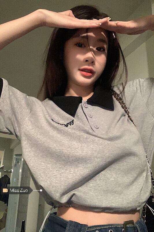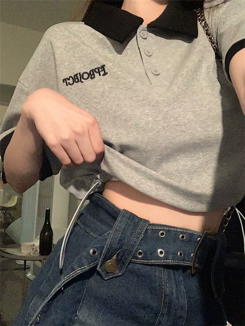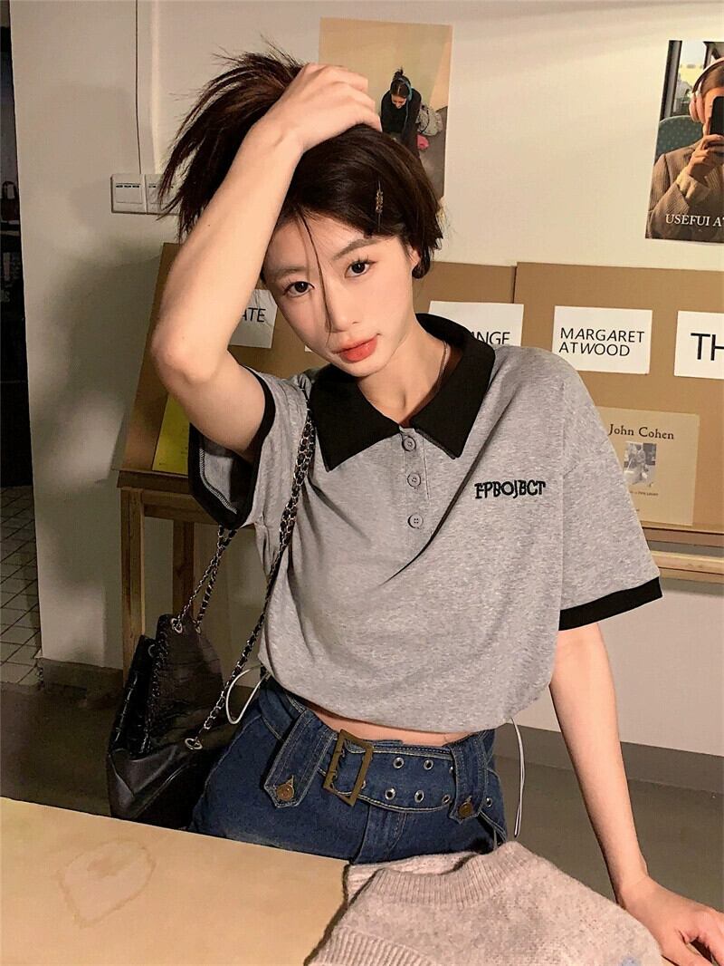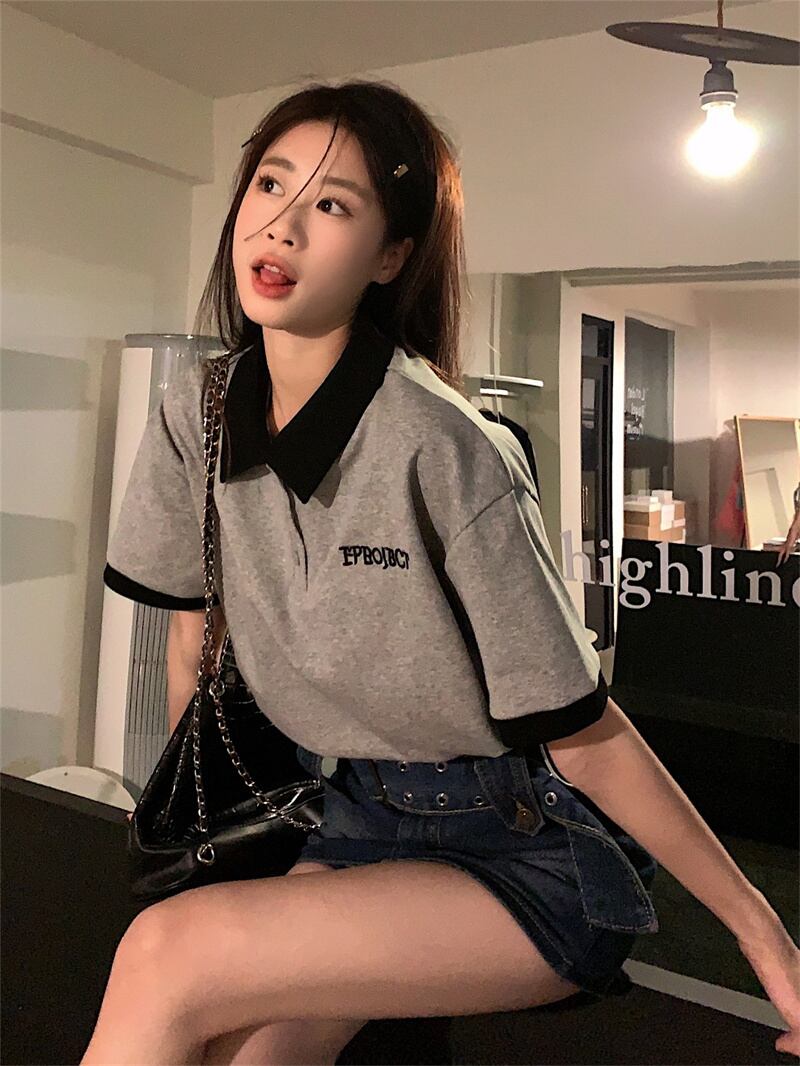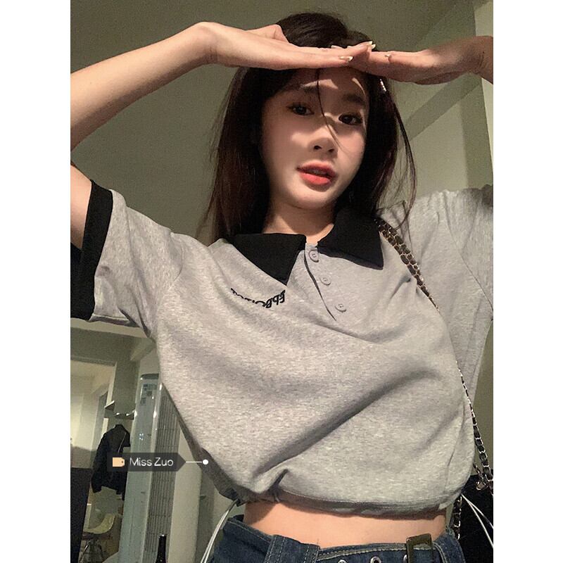 グレーのポロカラー半袖 Tシャツ女性の夏の小さなデザインセンスニッチシックなレトロショートトップ サマー 夏物 8571663772132108