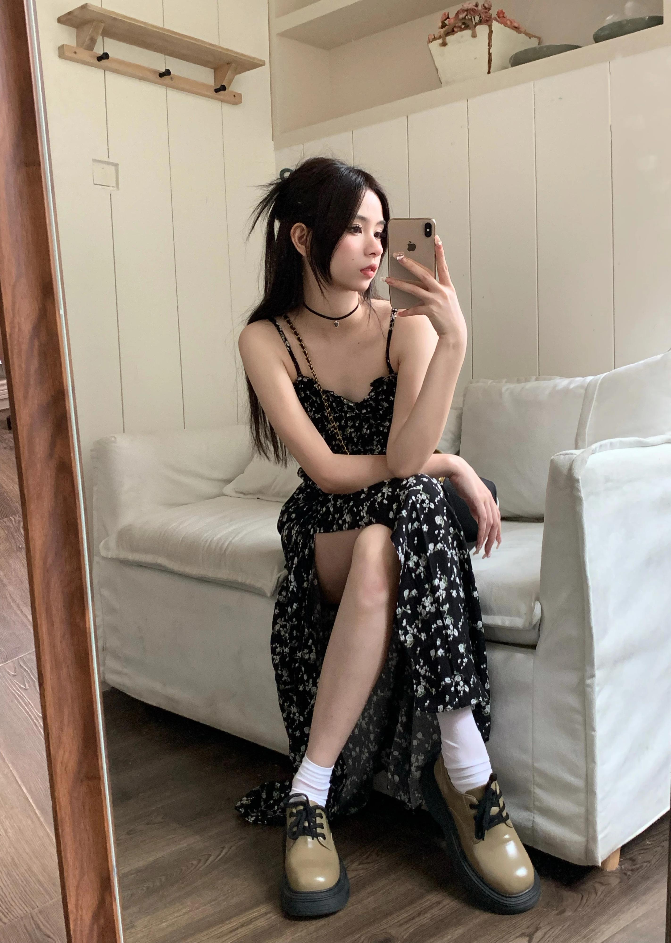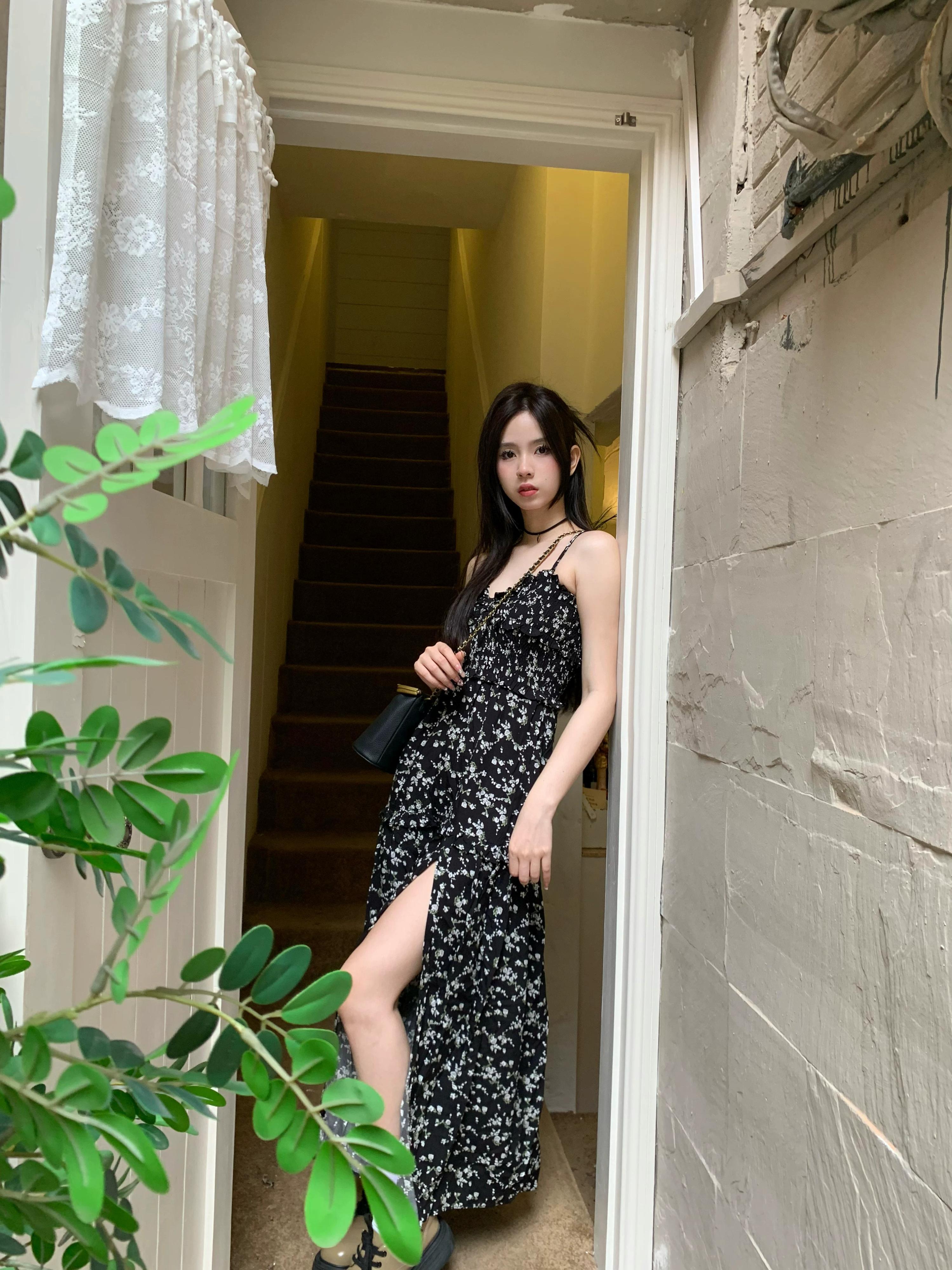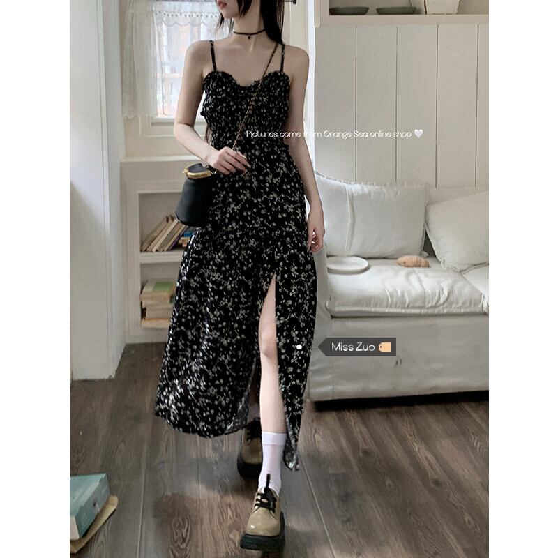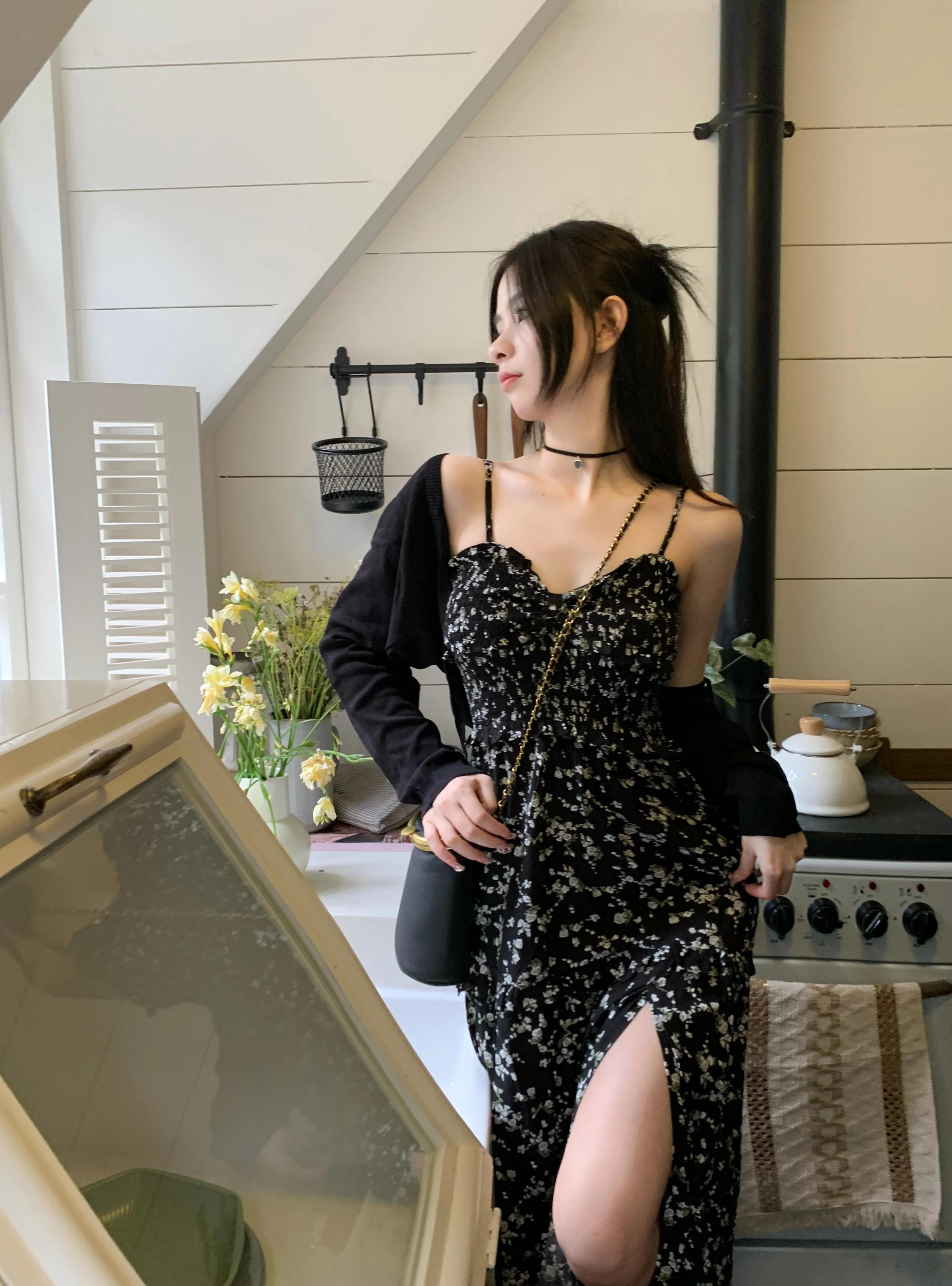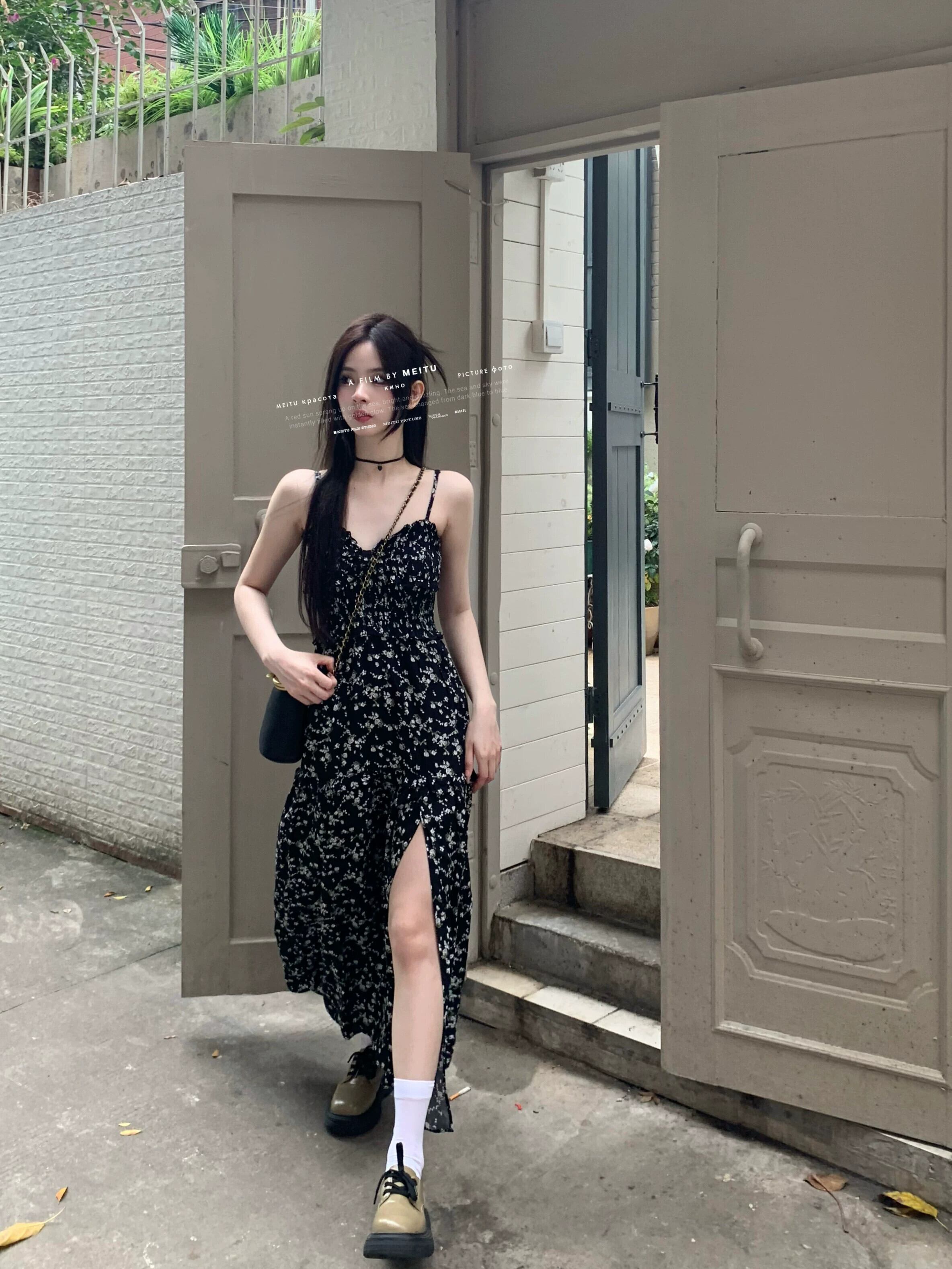 黒花柄スリングドレスレディース2023年夏新作ティーブレイクフレンチシックで美しいスリットロングスカート ブラック サマー 夏物 857164320654388