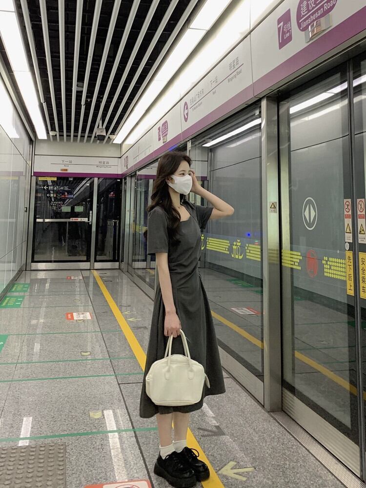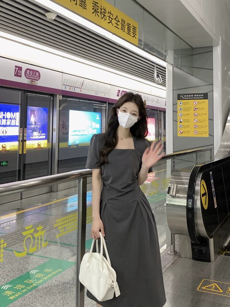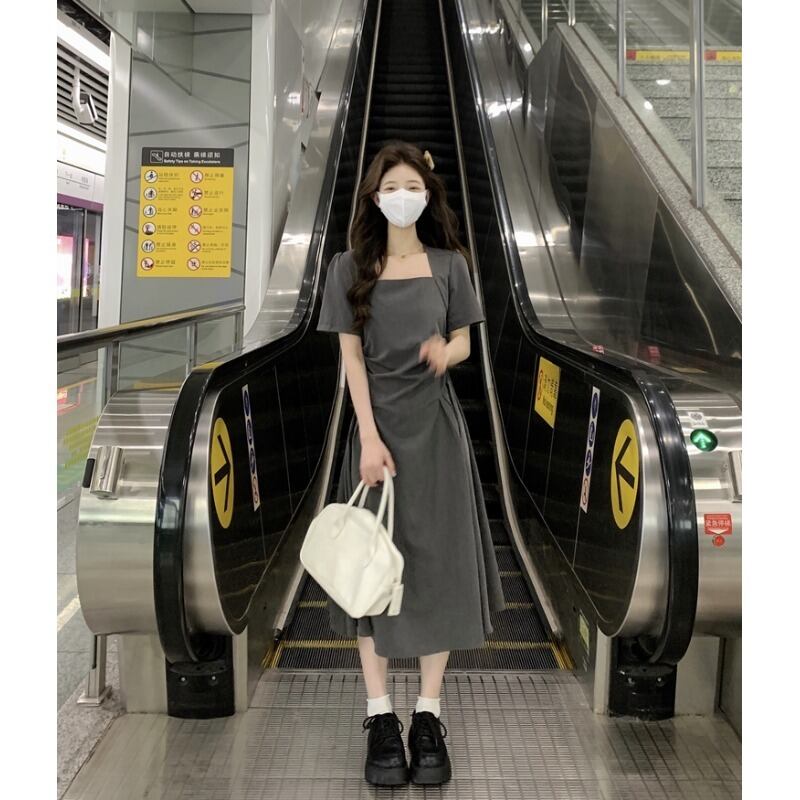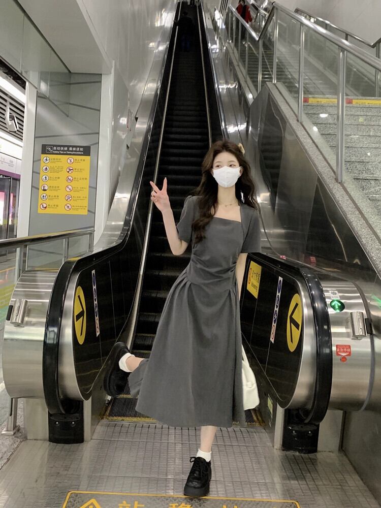 グレースクエアカラードレスの女性の夏の 2023 新しいニッチデザインセンススタイル着用スリムロングスカート サマー 夏物 スクウェア 8571659047465195