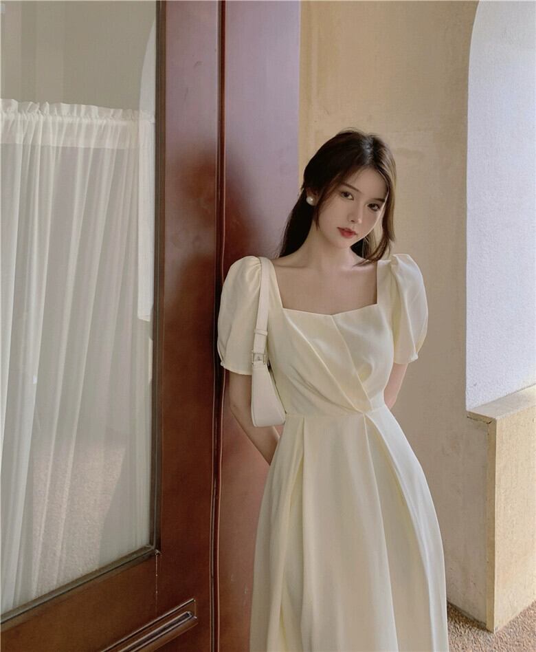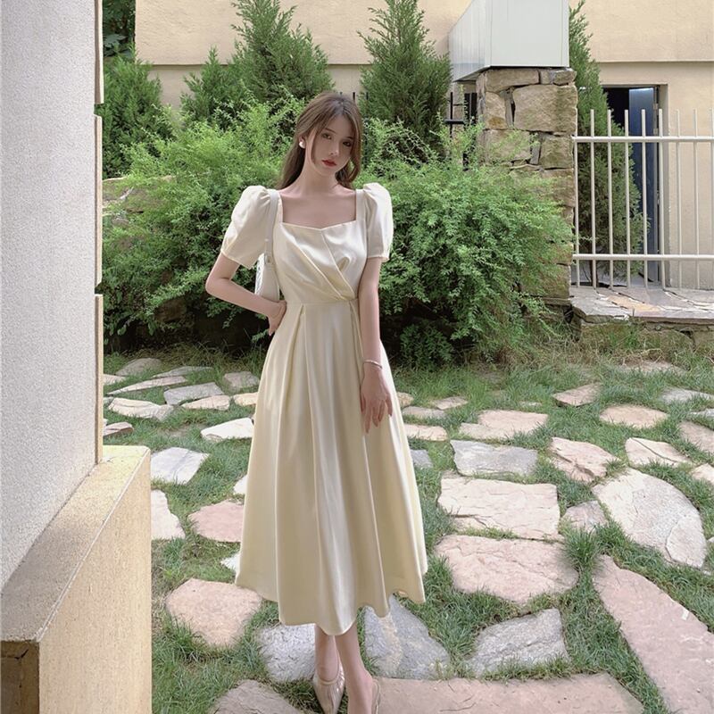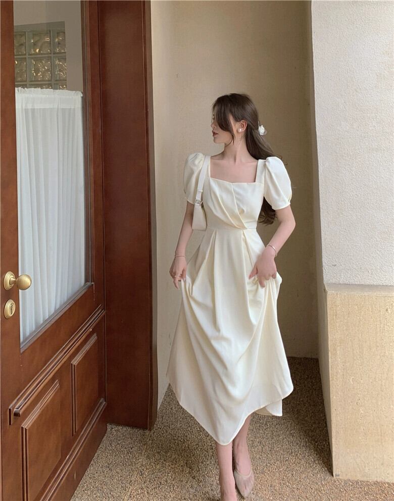 オフホワイトドレスレディース小夏デザインセンスニッチ気質高級感ウエストパフスリーブロングスカート サマー 夏物 8571627213450451
